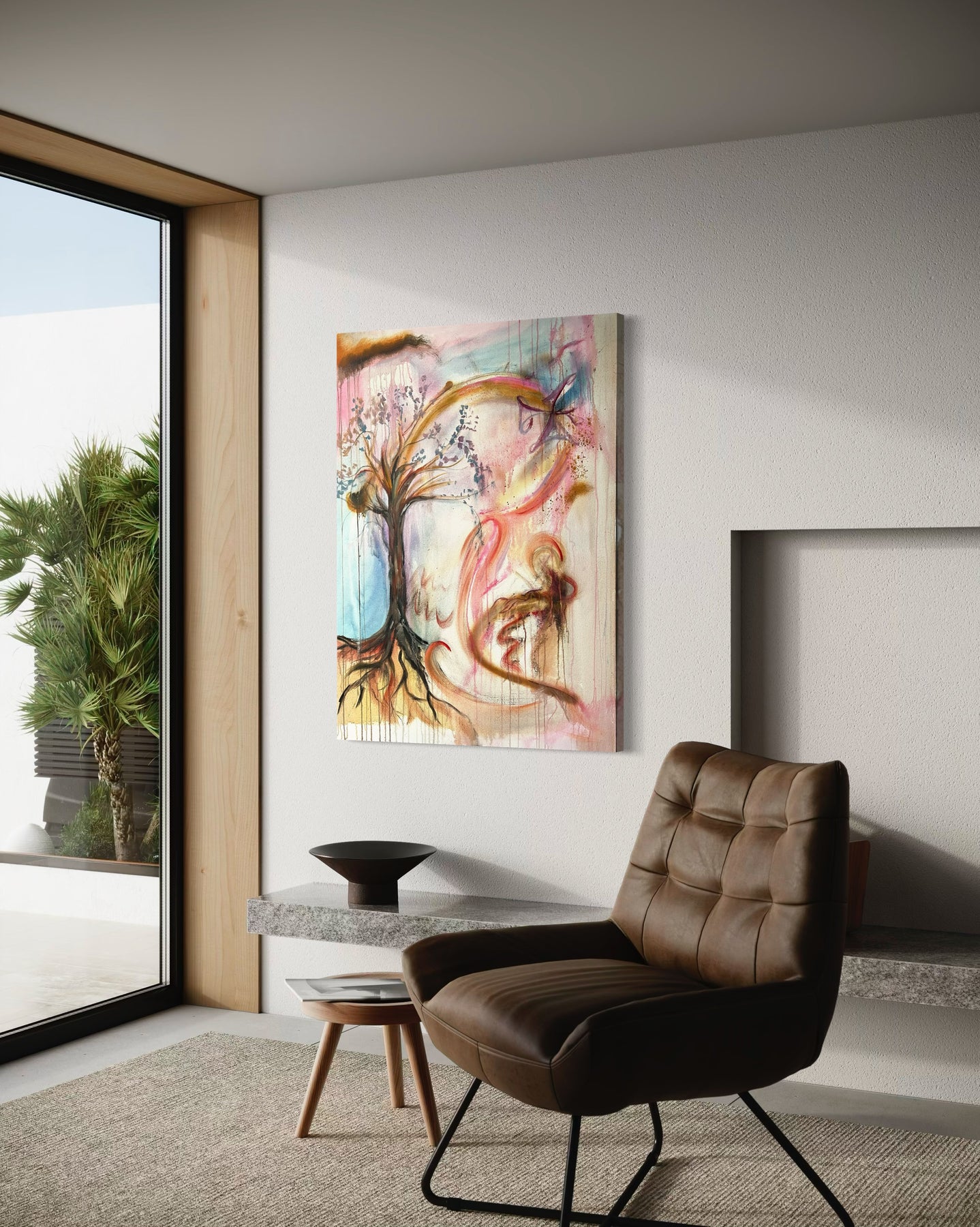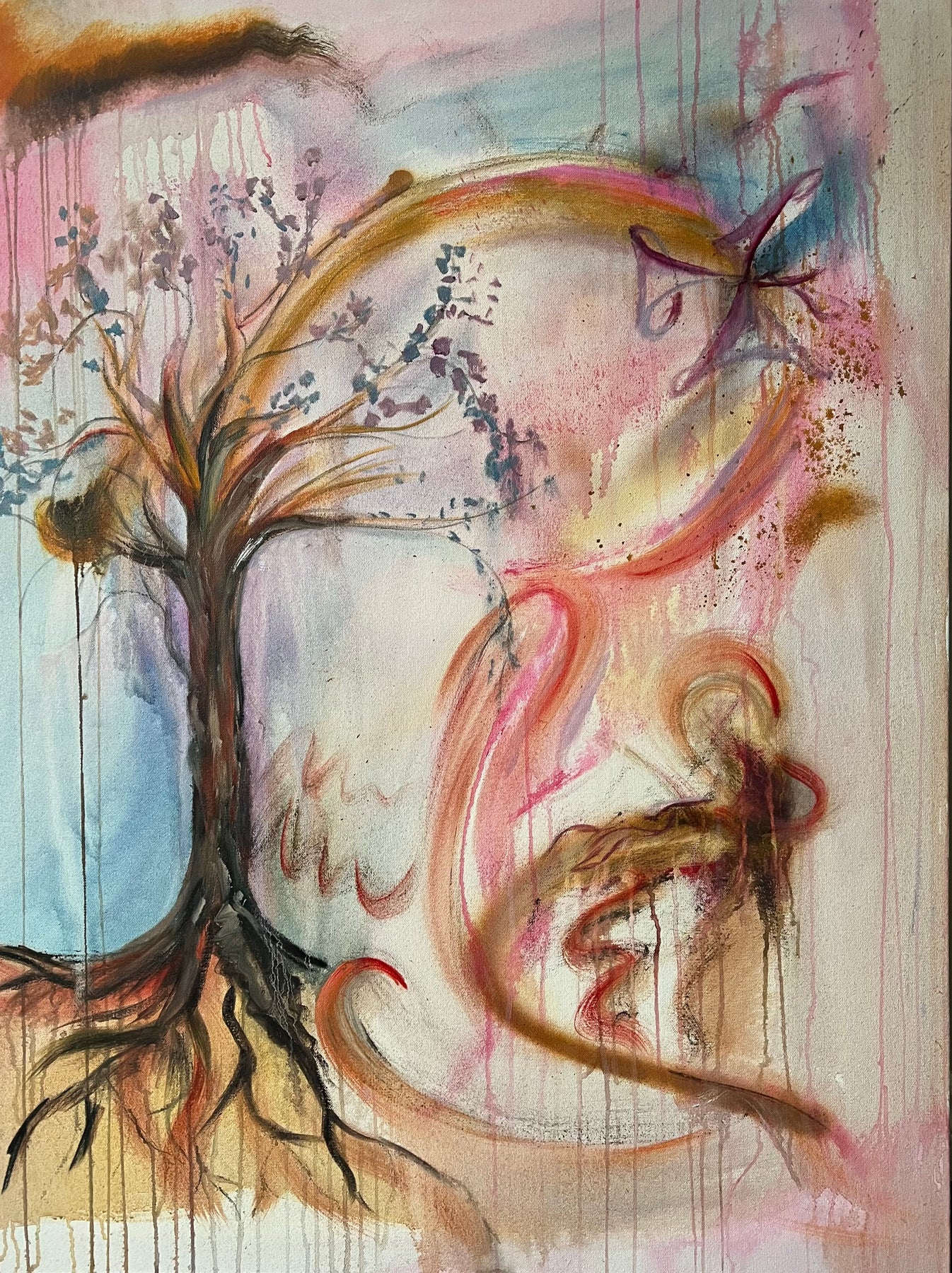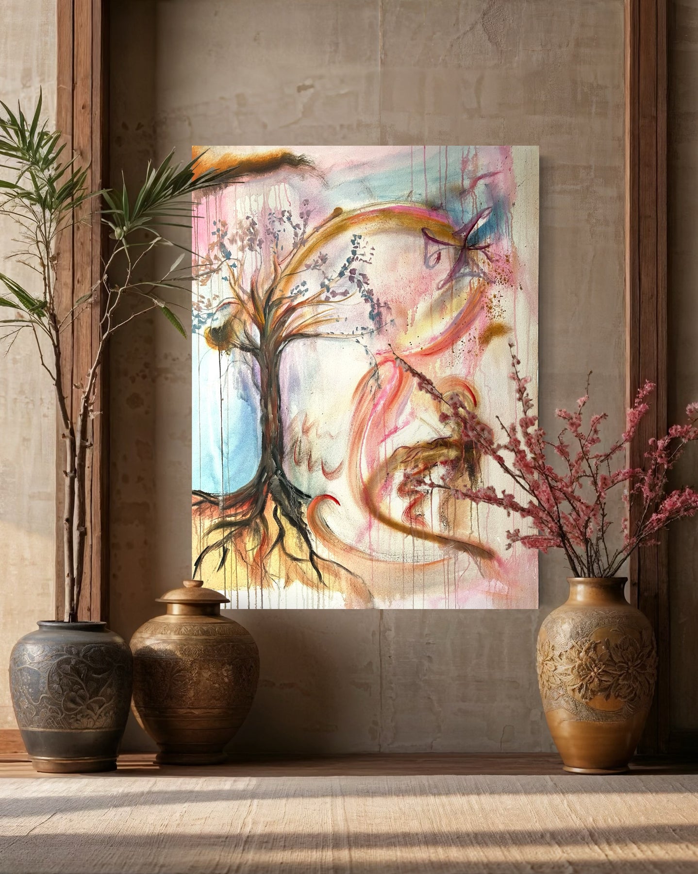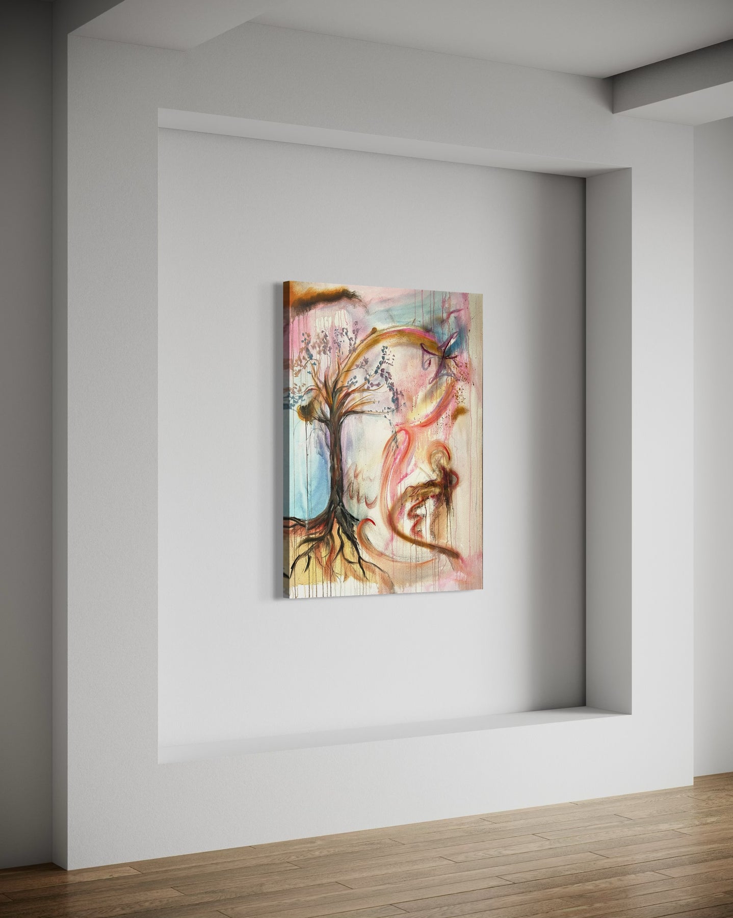 The painting itself is full of symbolism. A rooted tree stretches upward, its branches stirred by a golden arc that seems to carry life across the canvas. On the right, a figure leans into this flow—perhaps in worship, perhaps simply in surrender—while a butterfly hovers above, marking the sacredness of transformation.