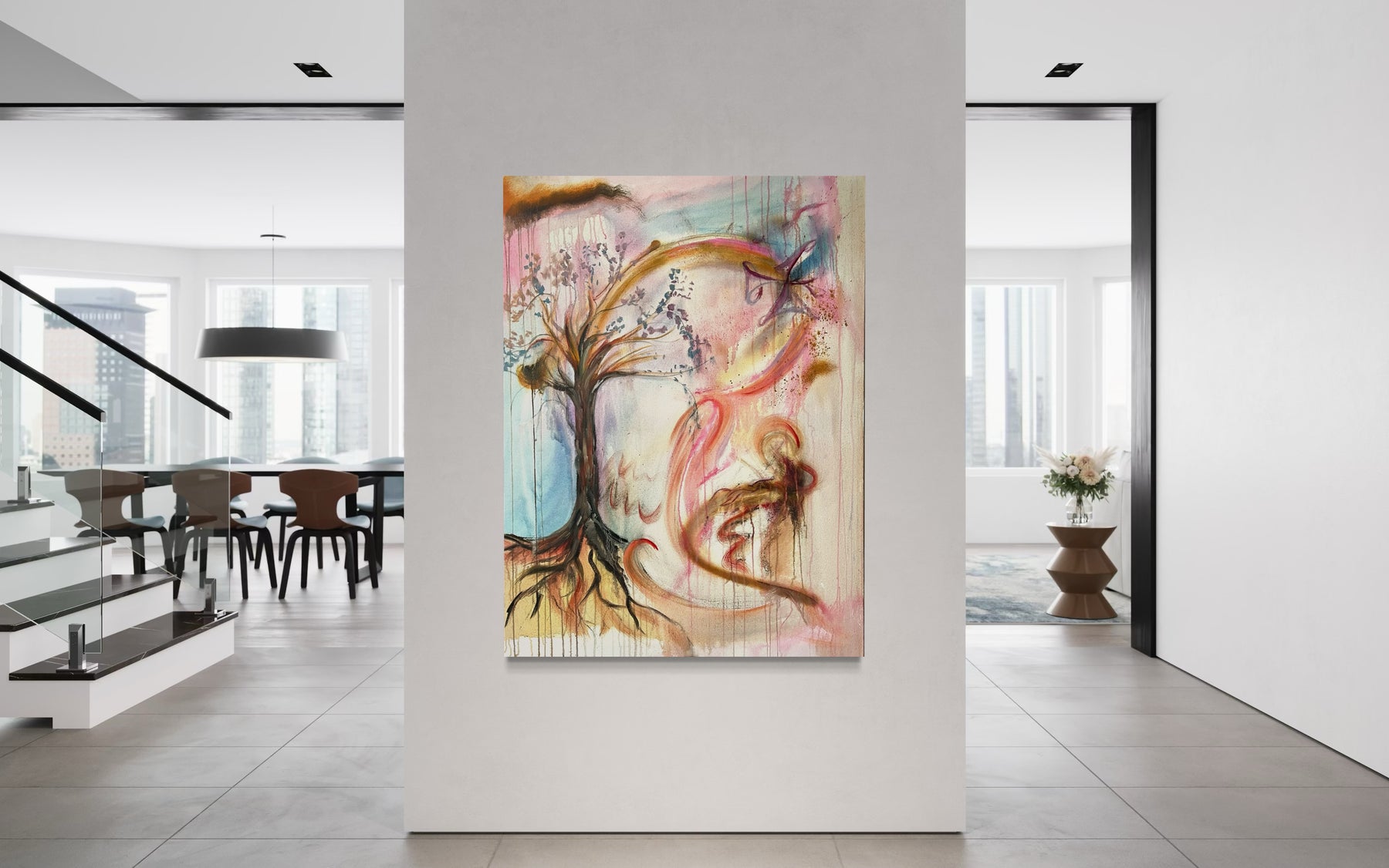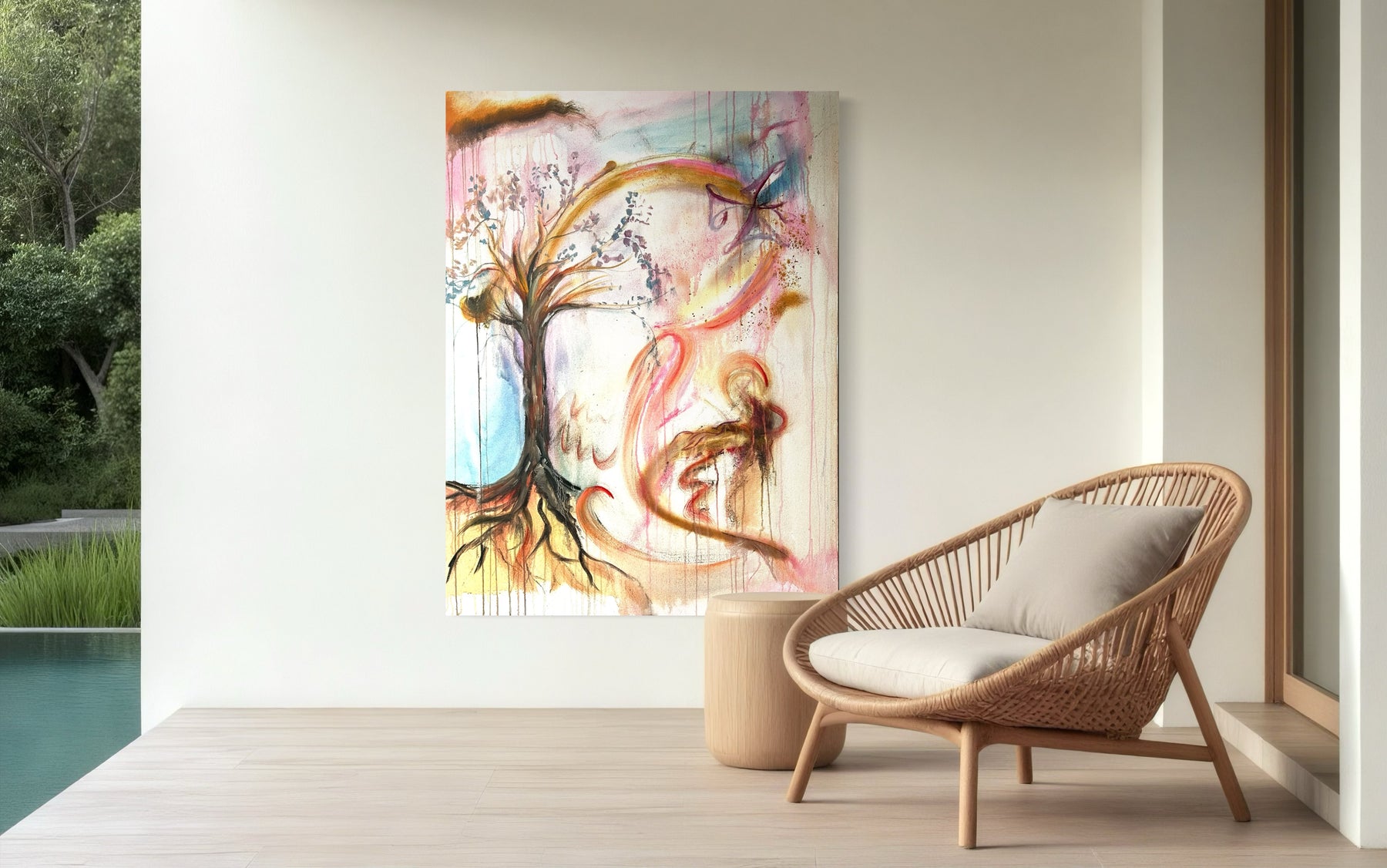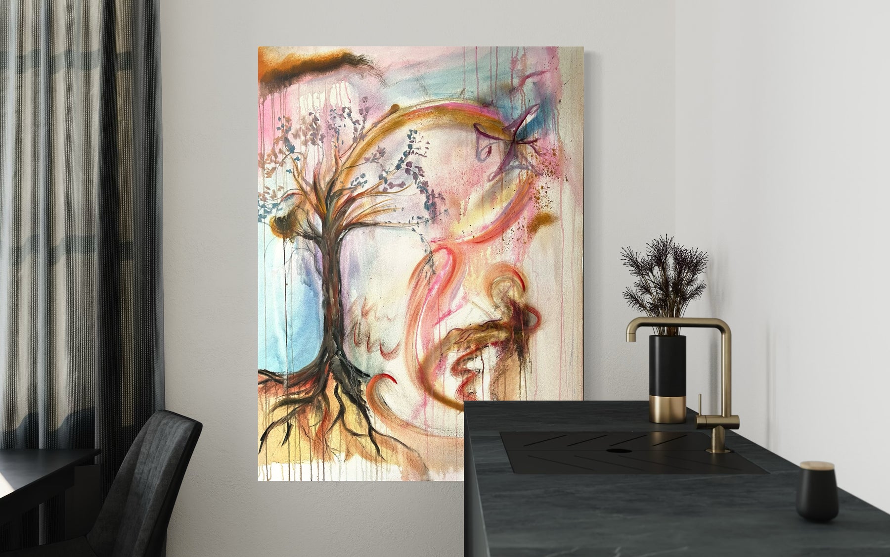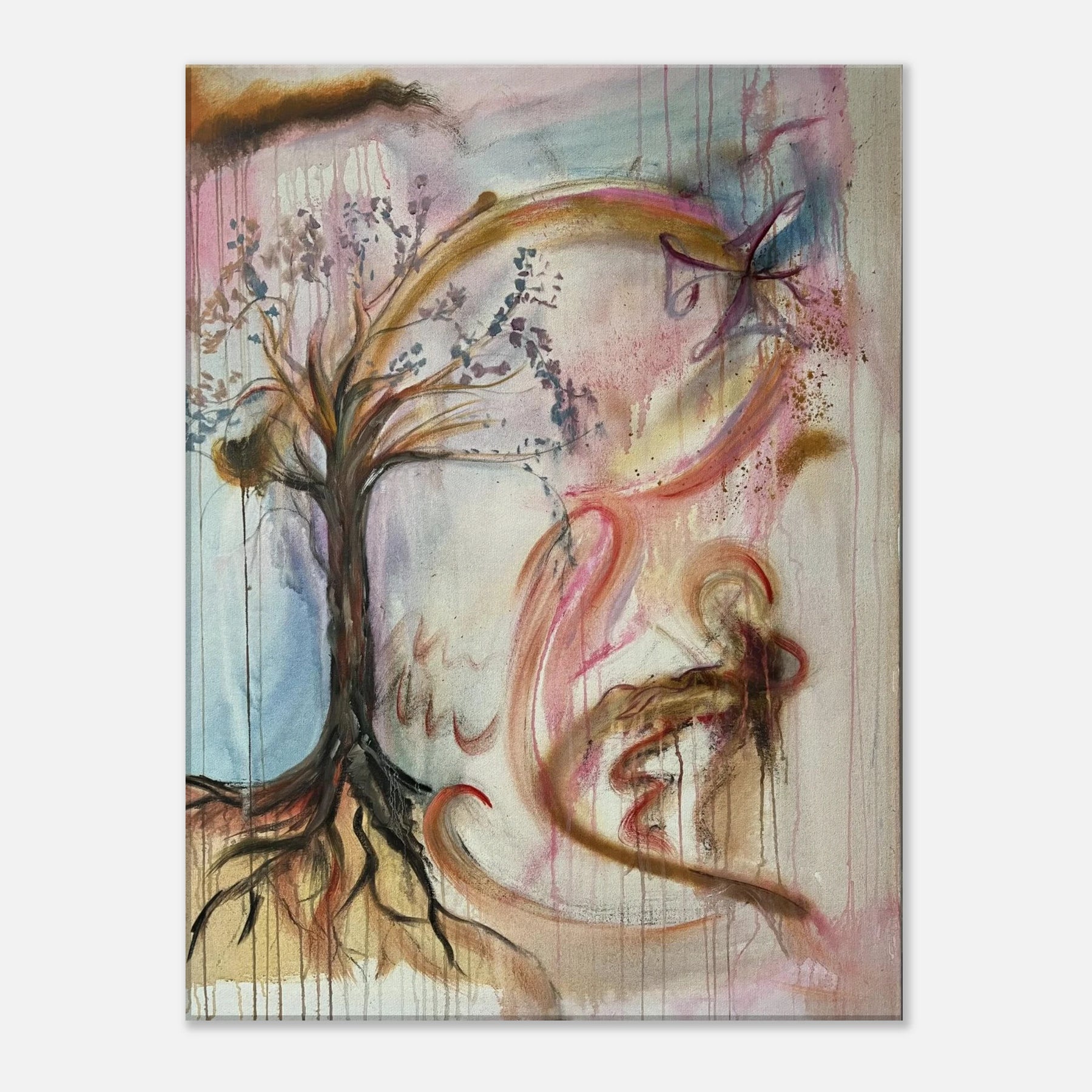 The painting itself is full of symbolism. A rooted tree stretches upward, its branches stirred by a golden arc that seems to carry life across the canvas. On the right, a figure leans into this flow—perhaps in worship, perhaps simply in surrender—while a butterfly hovers above, marking the sacredness of transformation.
