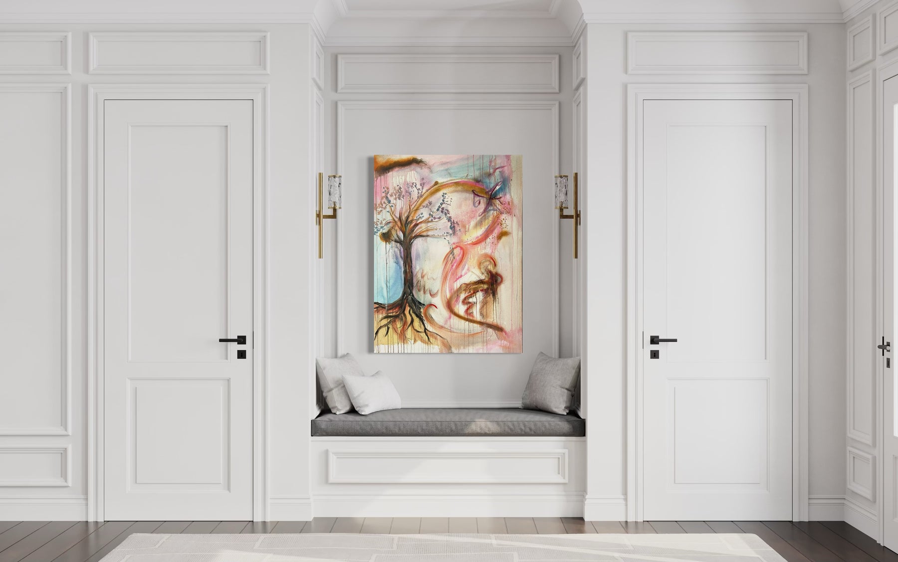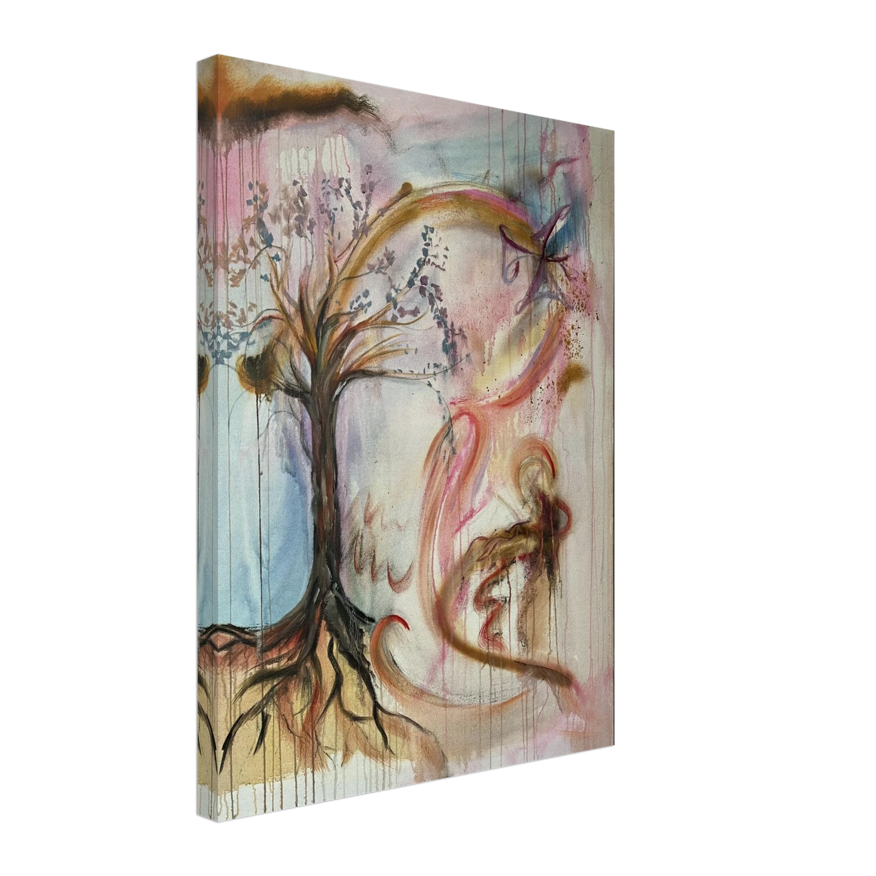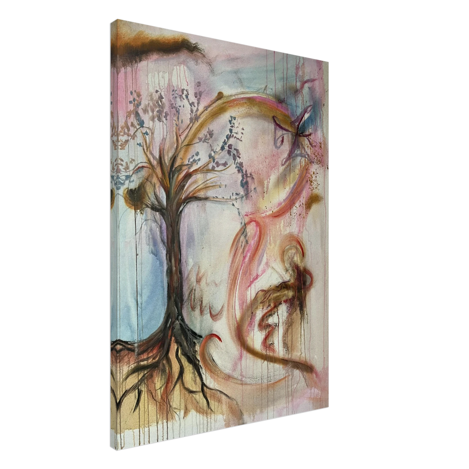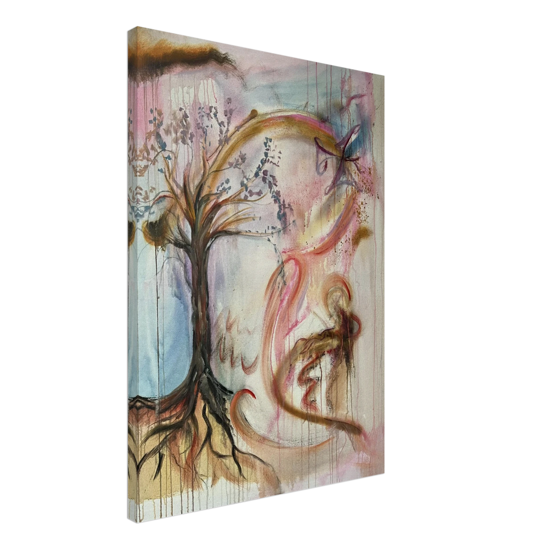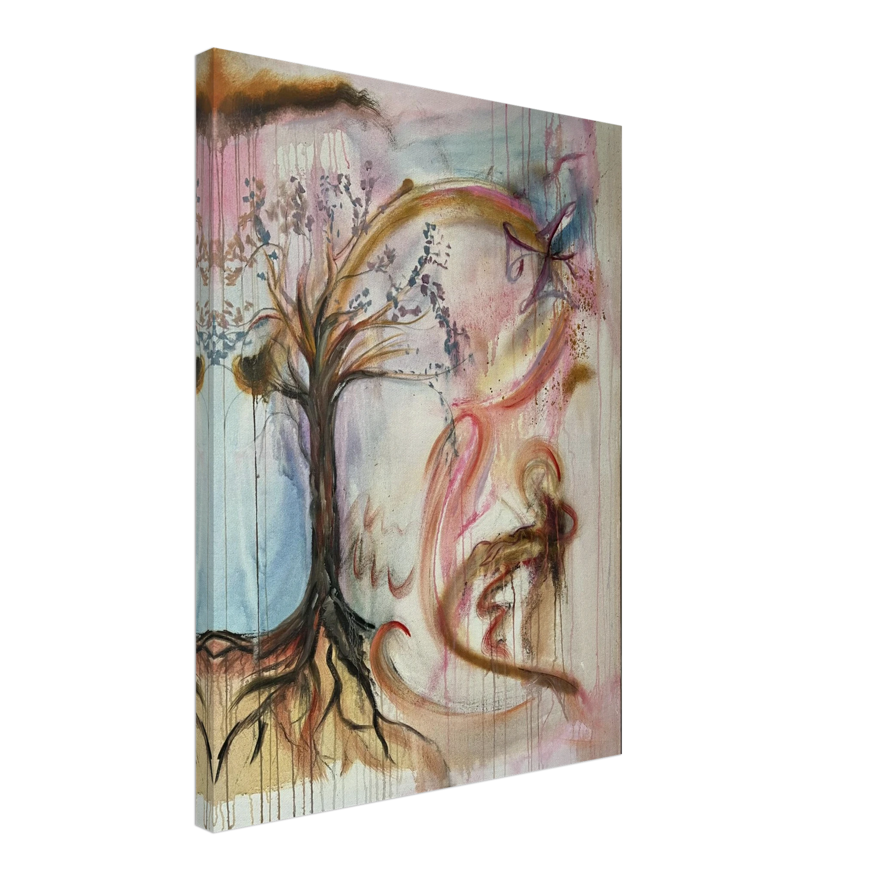 The painting itself is full of symbolism. A rooted tree stretches upward, its branches stirred by a golden arc that seems to carry life across the canvas. On the right, a figure leans into this flow—perhaps in worship, perhaps simply in surrender—while a butterfly hovers above, marking the sacredness of transformation.