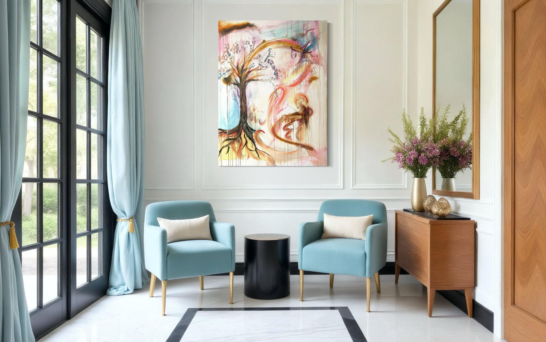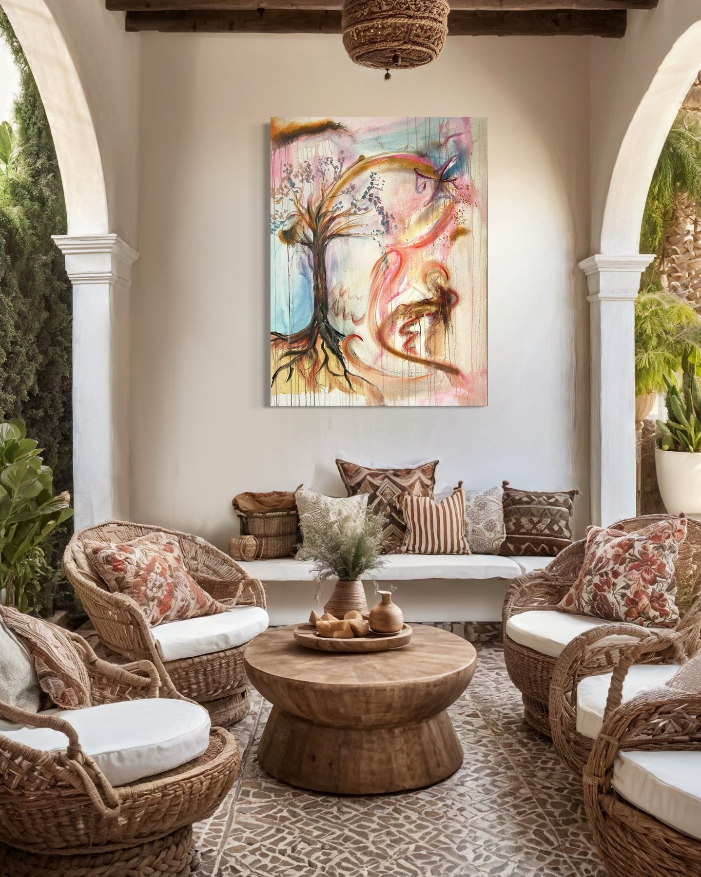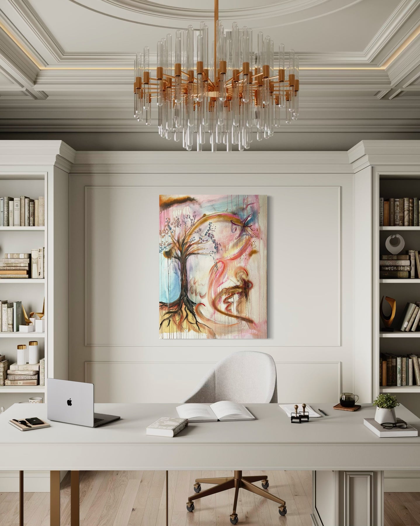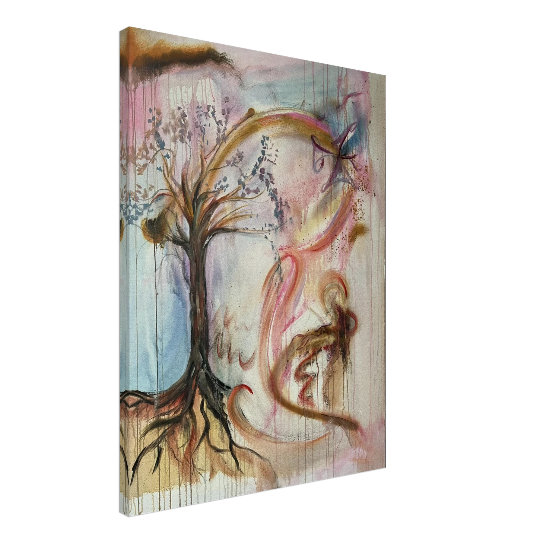 The painting itself is full of symbolism. A rooted tree stretches upward, its branches stirred by a golden arc that seems to carry life across the canvas. On the right, a figure leans into this flow—perhaps in worship, perhaps simply in surrender—while a butterfly hovers above, marking the sacredness of transformation.