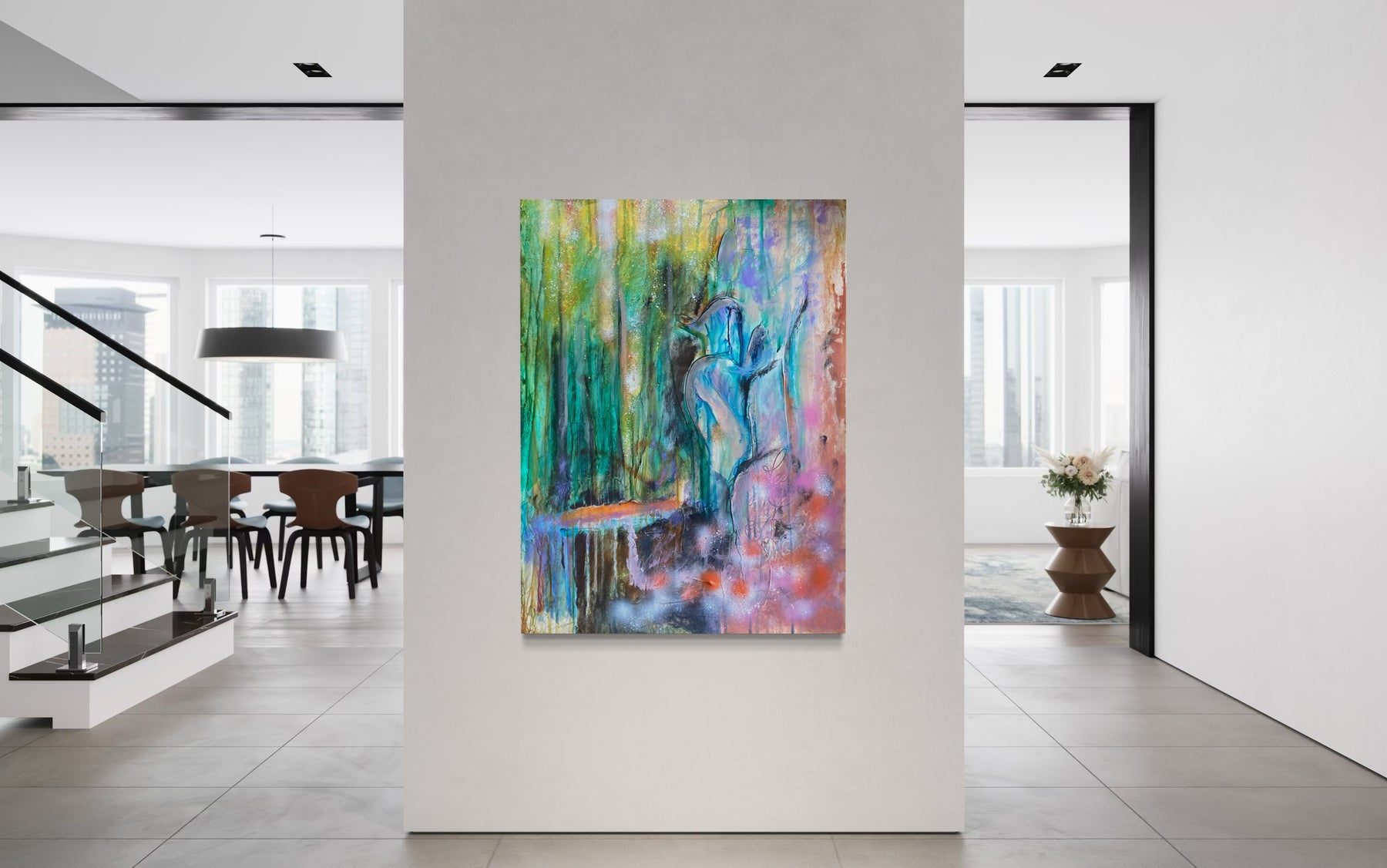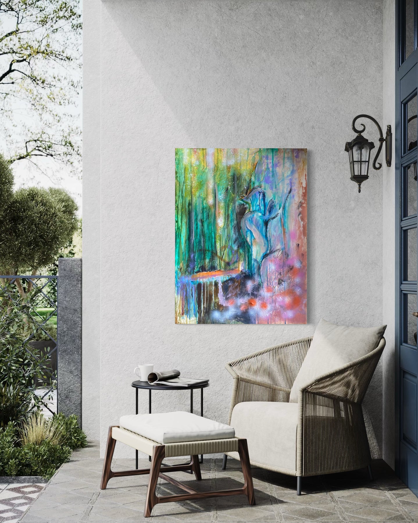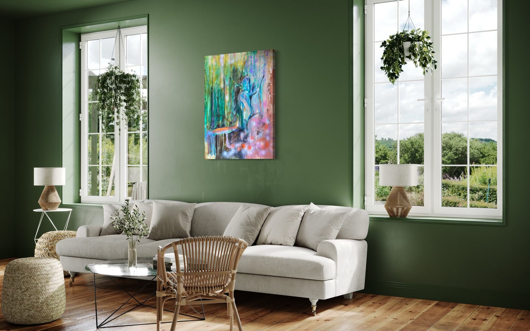 This piece is one of the more personal works in the Created in Colour collection. Inspired by a vivid daydream of a glittering forest and a small bird resting peacefully on a branch, Internal Validation is about learning to be still with yourself—and to know that is enough.