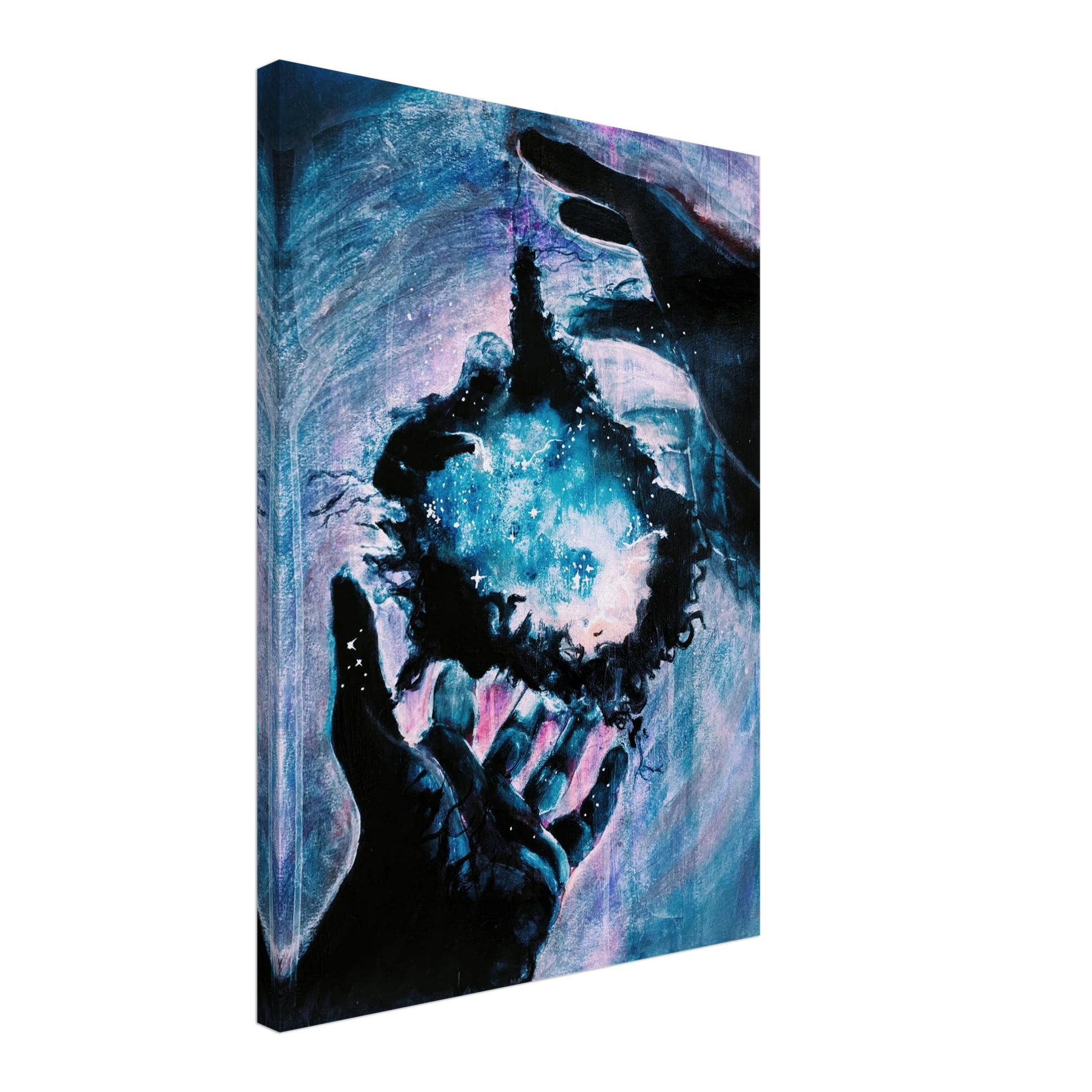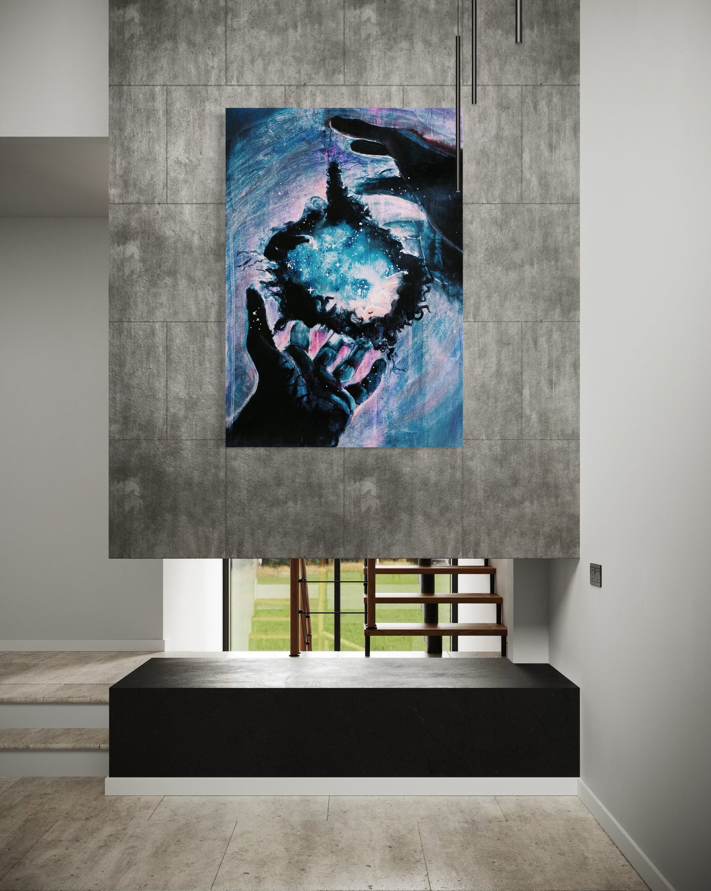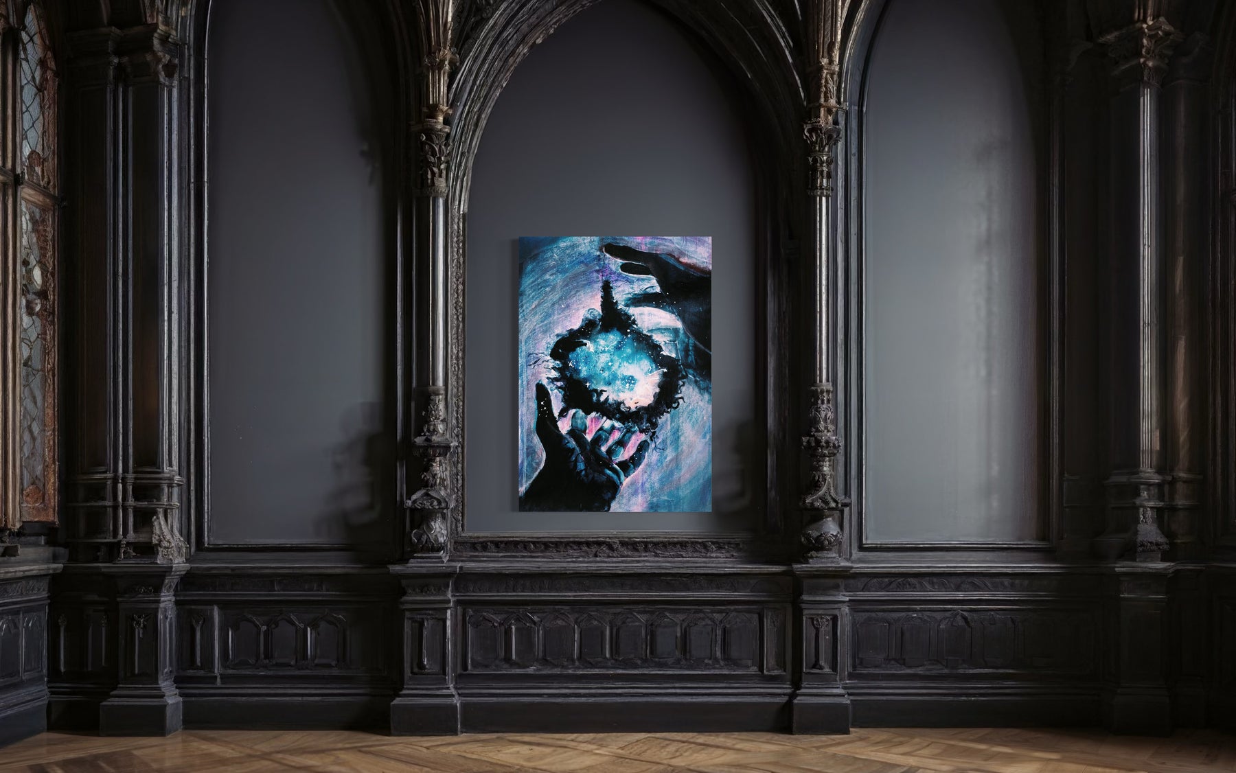 I didn’t start with a plan—just a deep pull to explore the space between heaven and earth. I laid down layers of colour, shadow, and light, letting my hands move before my mind could catch up. Slowly, a shape began to take form between the palms—celestial, raw, and alive.