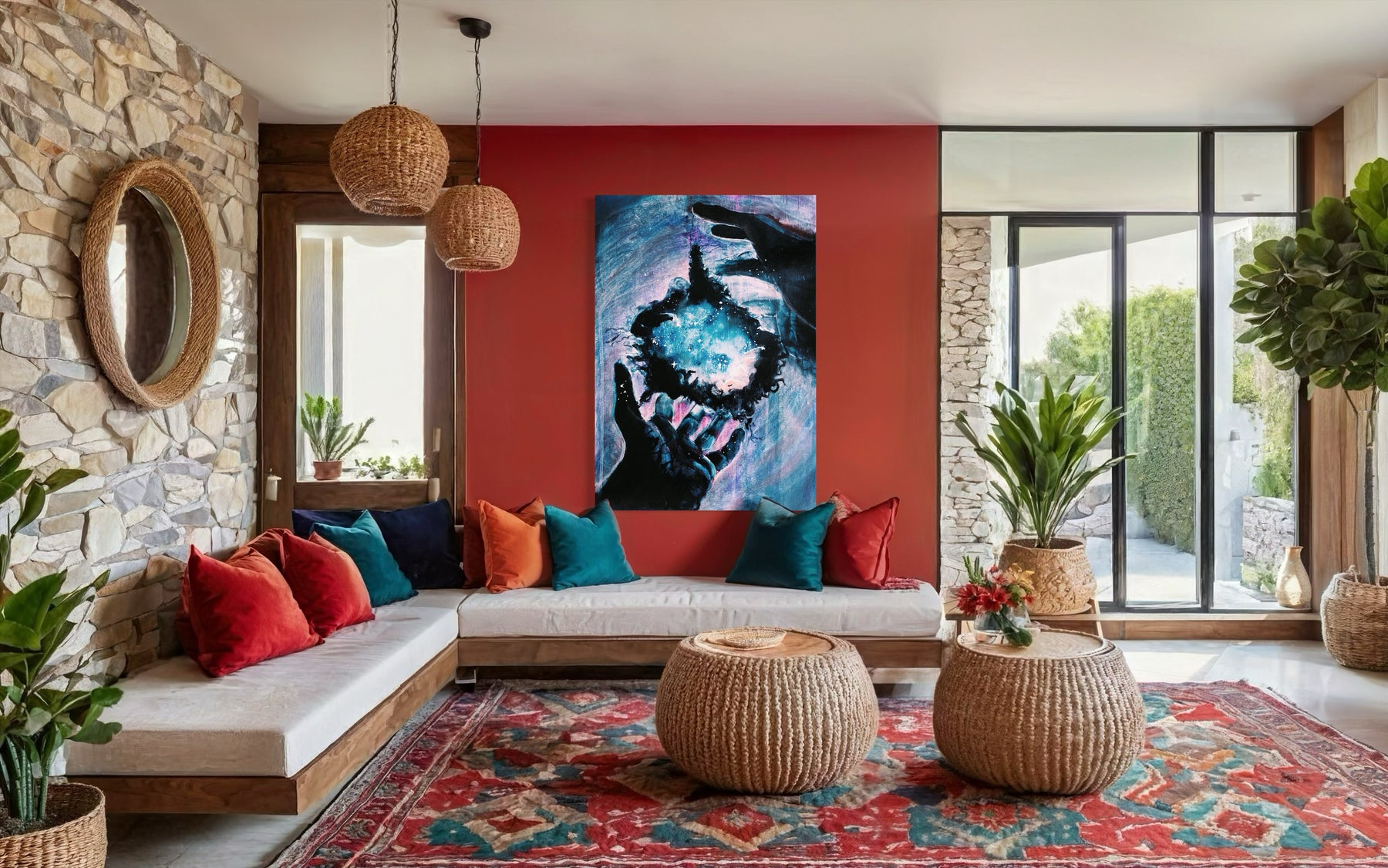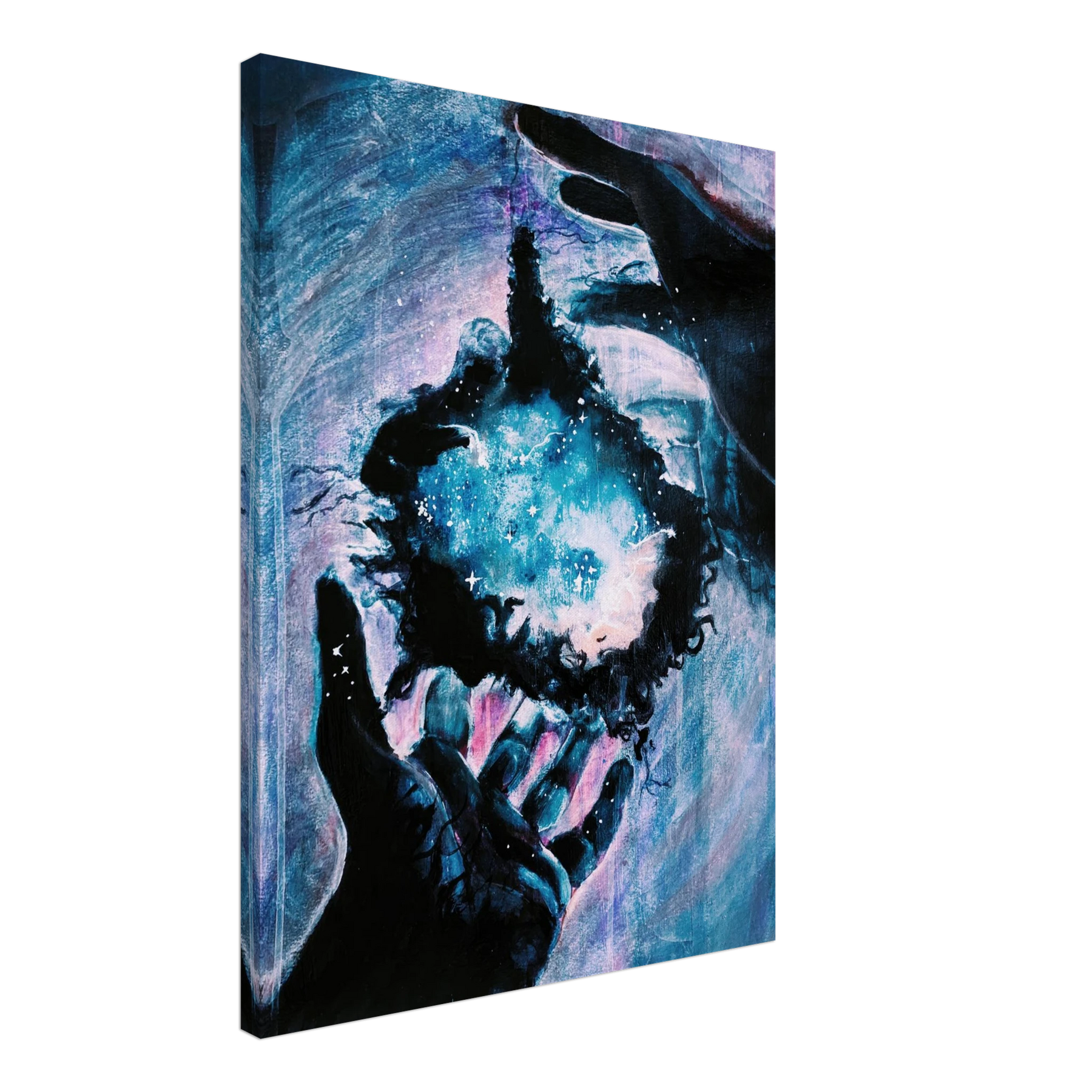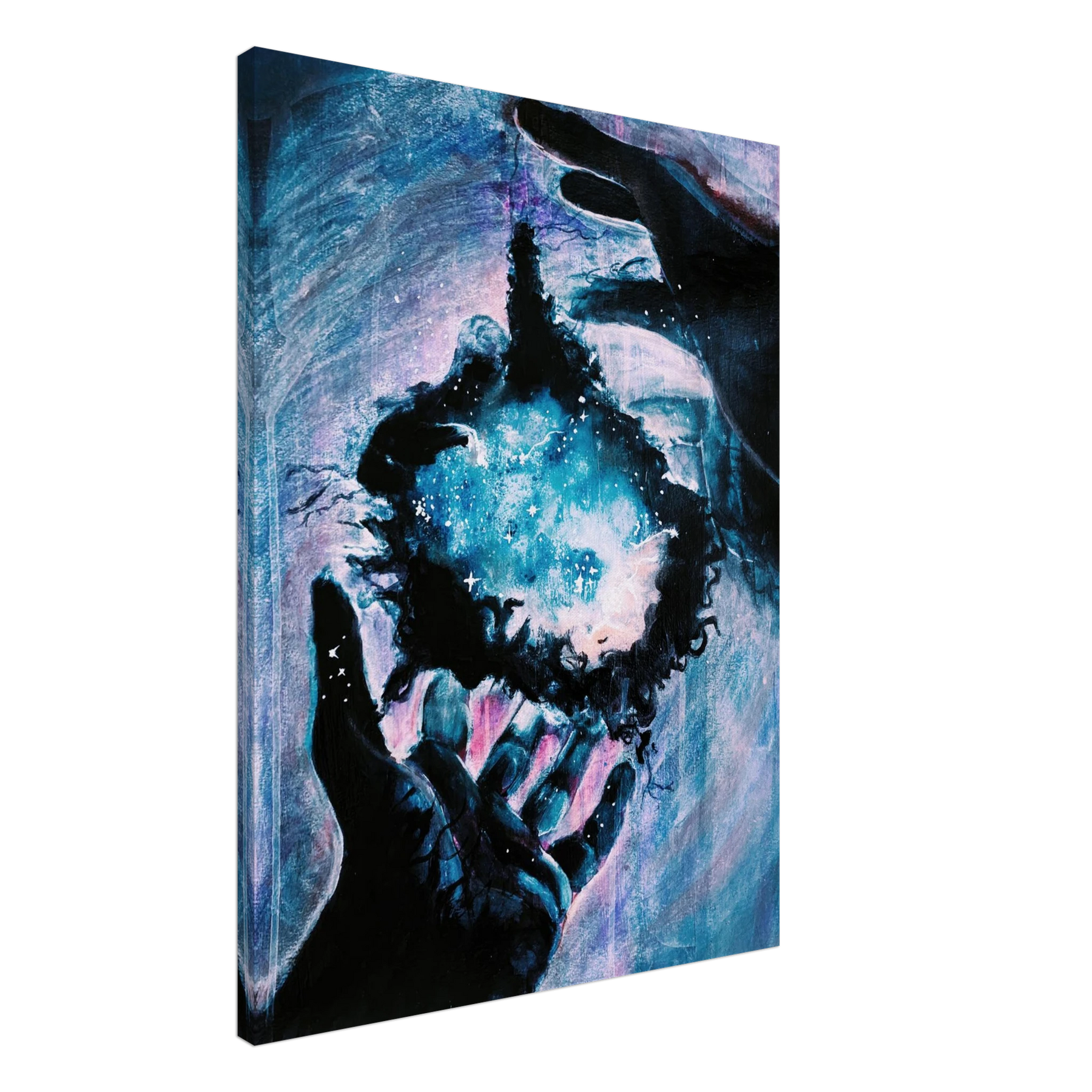 I didn’t start with a plan—just a deep pull to explore the space between heaven and earth. I laid down layers of colour, shadow, and light, letting my hands move before my mind could catch up. Slowly, a shape began to take form between the palms—celestial, raw, and alive.
