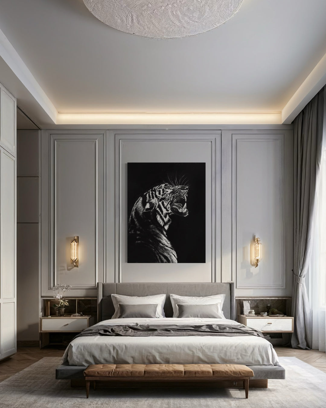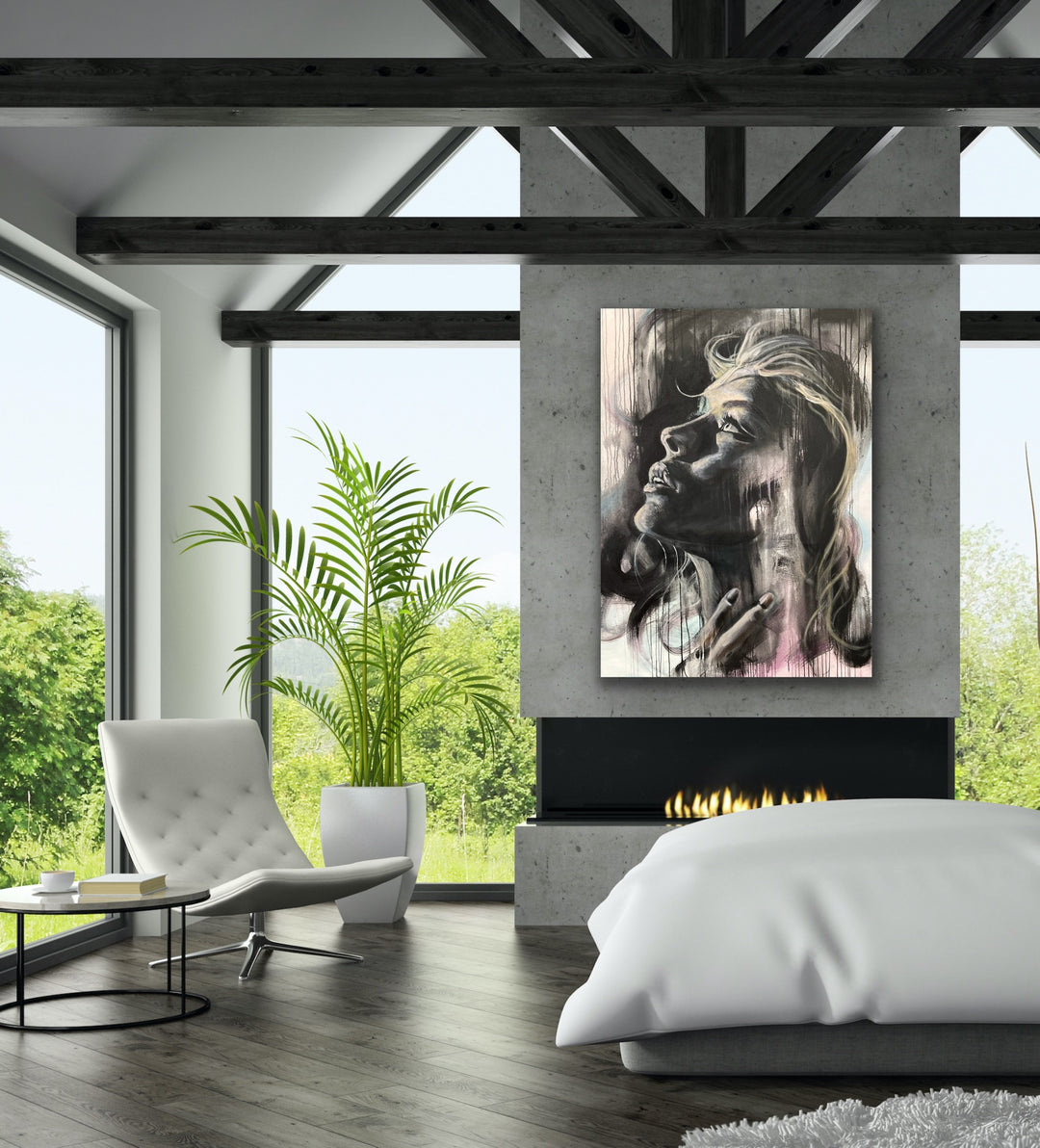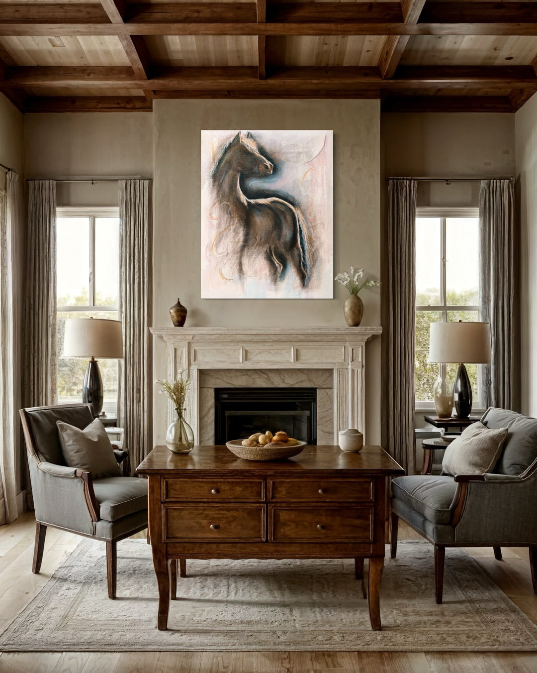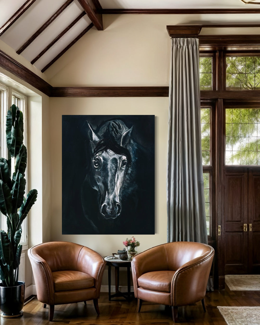 The colour palette flows like the sky itself: deep blacks, soft grays, pure whites, and hints of pastel light—capturing not just the night, but also the tender moments of dawn, dusk, and twilight. Woven through each piece are portraits of women, wildlife, and celestial elements, all connected by the unseen rhythms of creation and the quiet pull toward something greater.