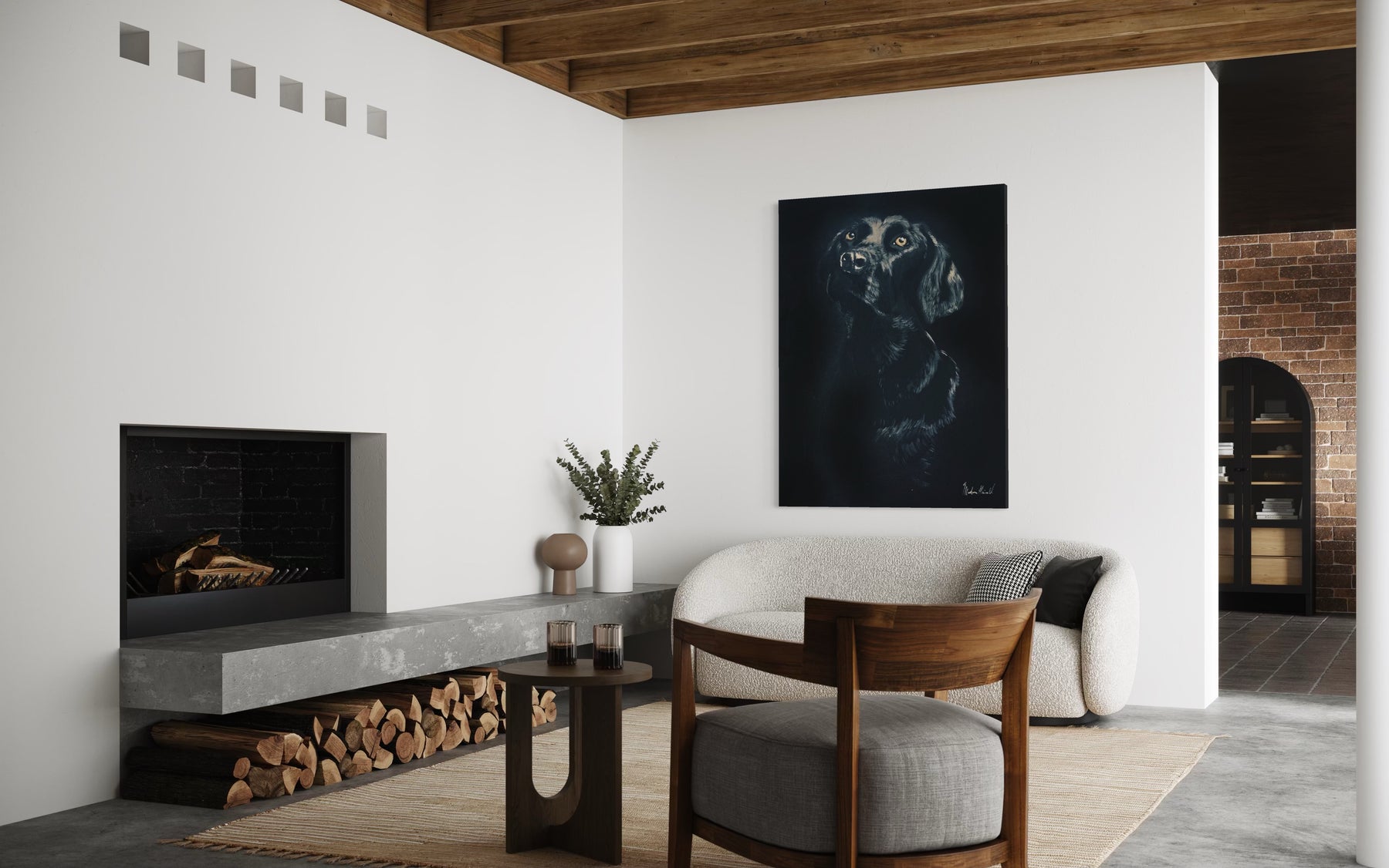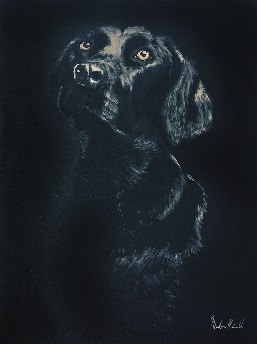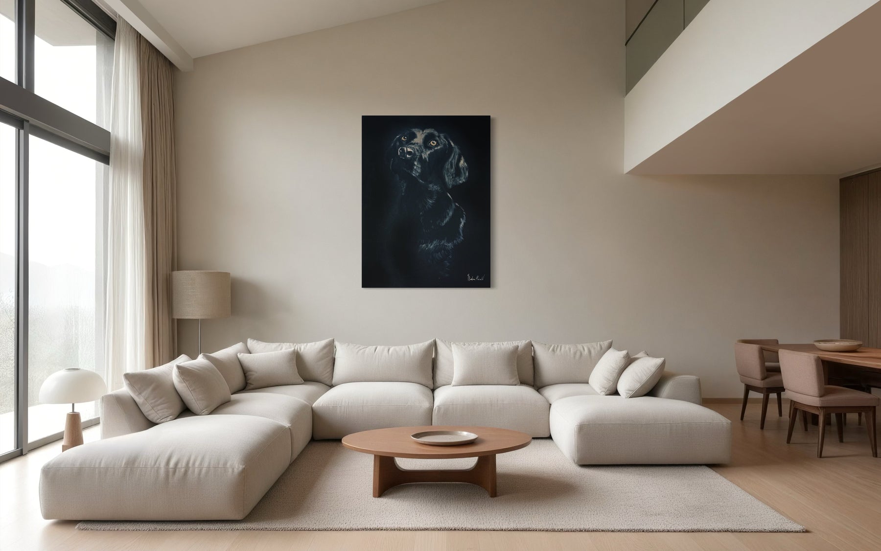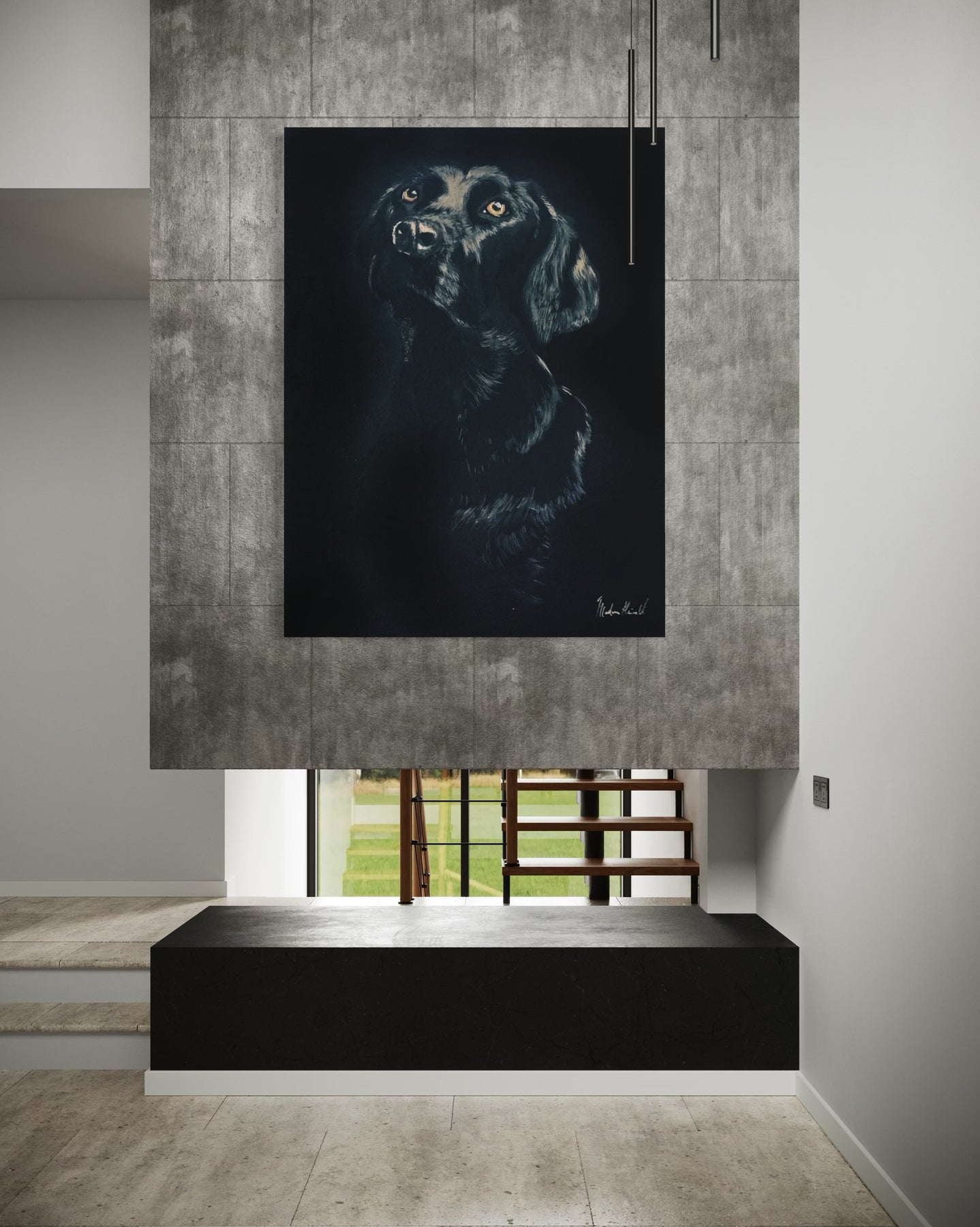 “The Watcher” was painted in a moment of reflection, thinking about the bonds we form with the creatures we love, and how they so often see us more clearly than we see ourselves. This dog isn’t simply posing—it’s bearing witness. Quietly present. Utterly devoted.