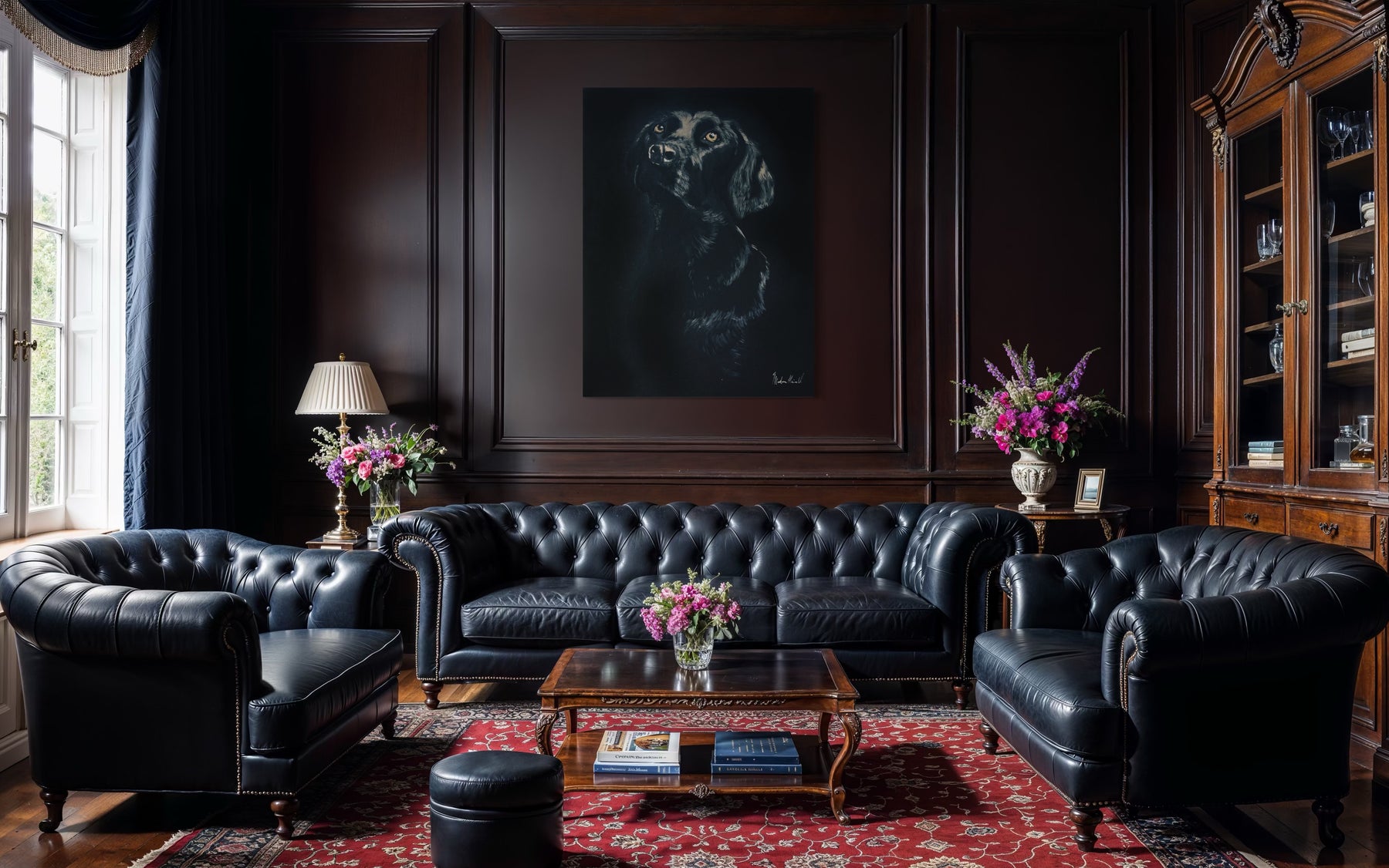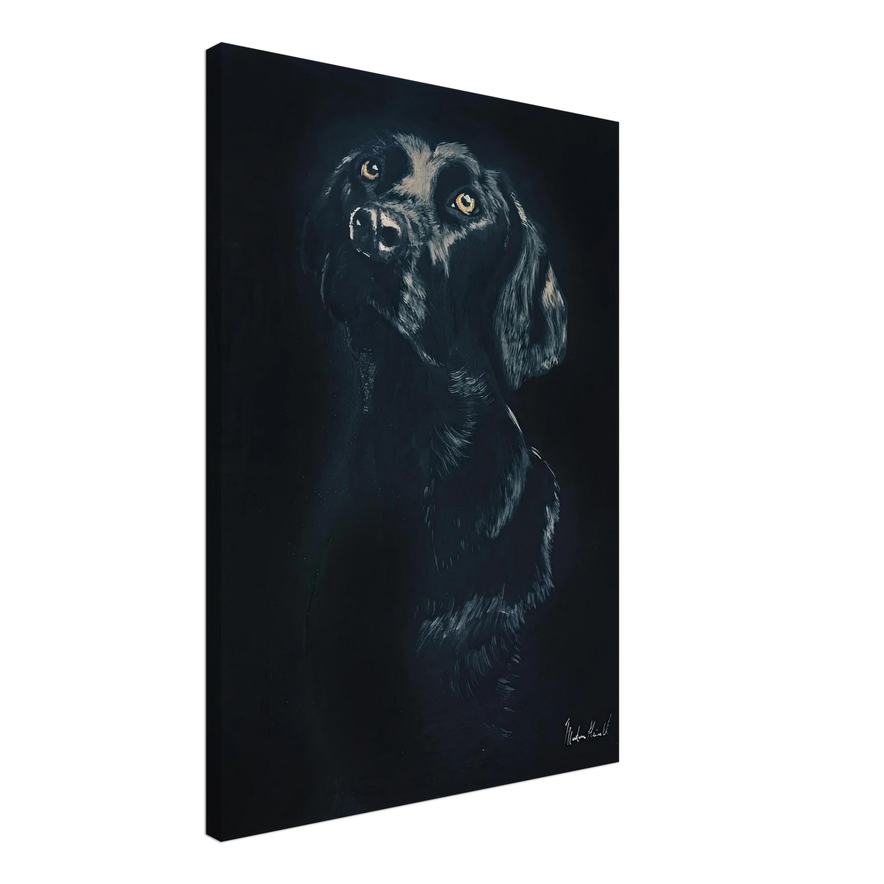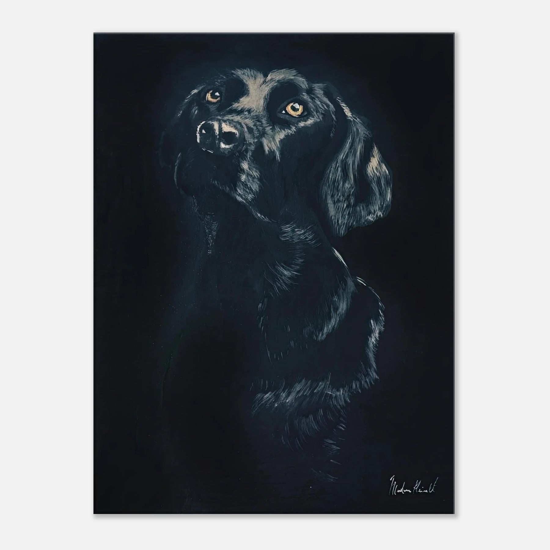 “The Watcher” was painted in a moment of reflection, thinking about the bonds we form with the creatures we love, and how they so often see us more clearly than we see ourselves. This dog isn’t simply posing—it’s bearing witness. Quietly present. Utterly devoted.