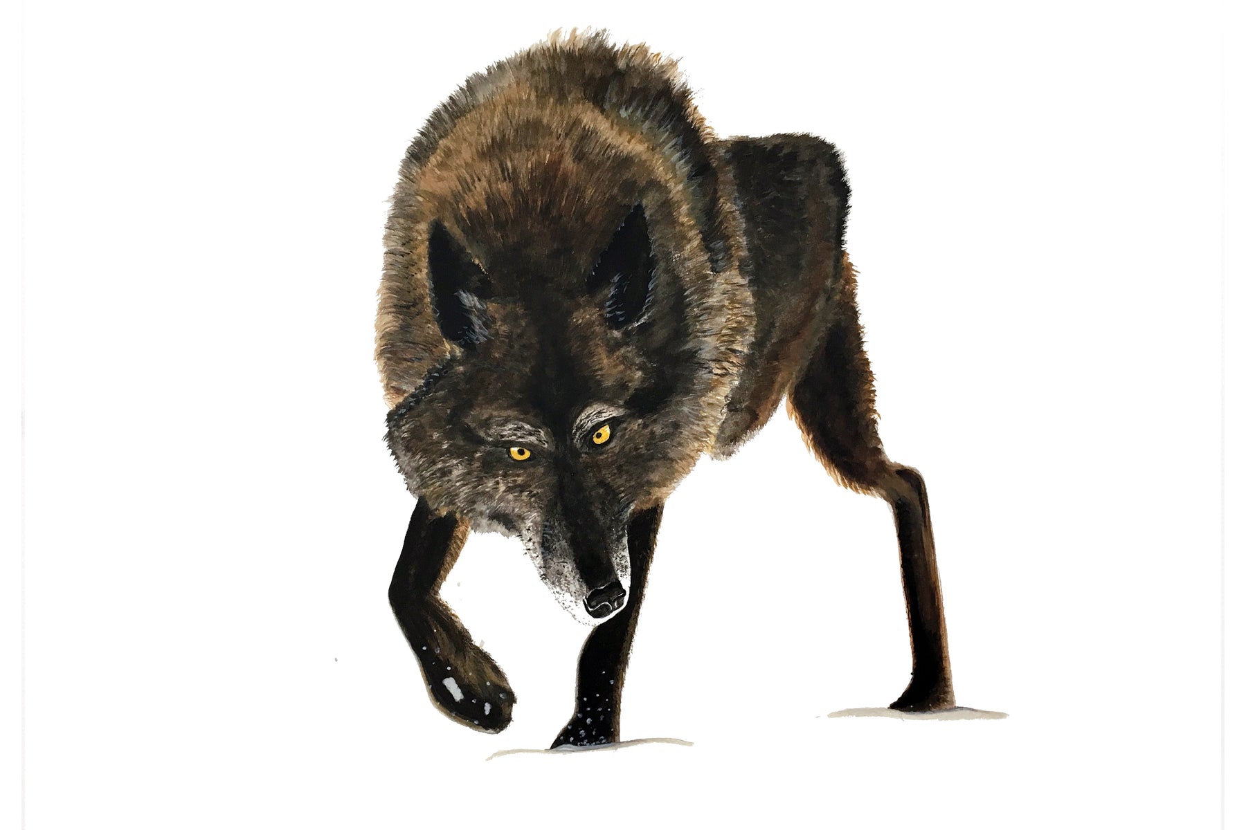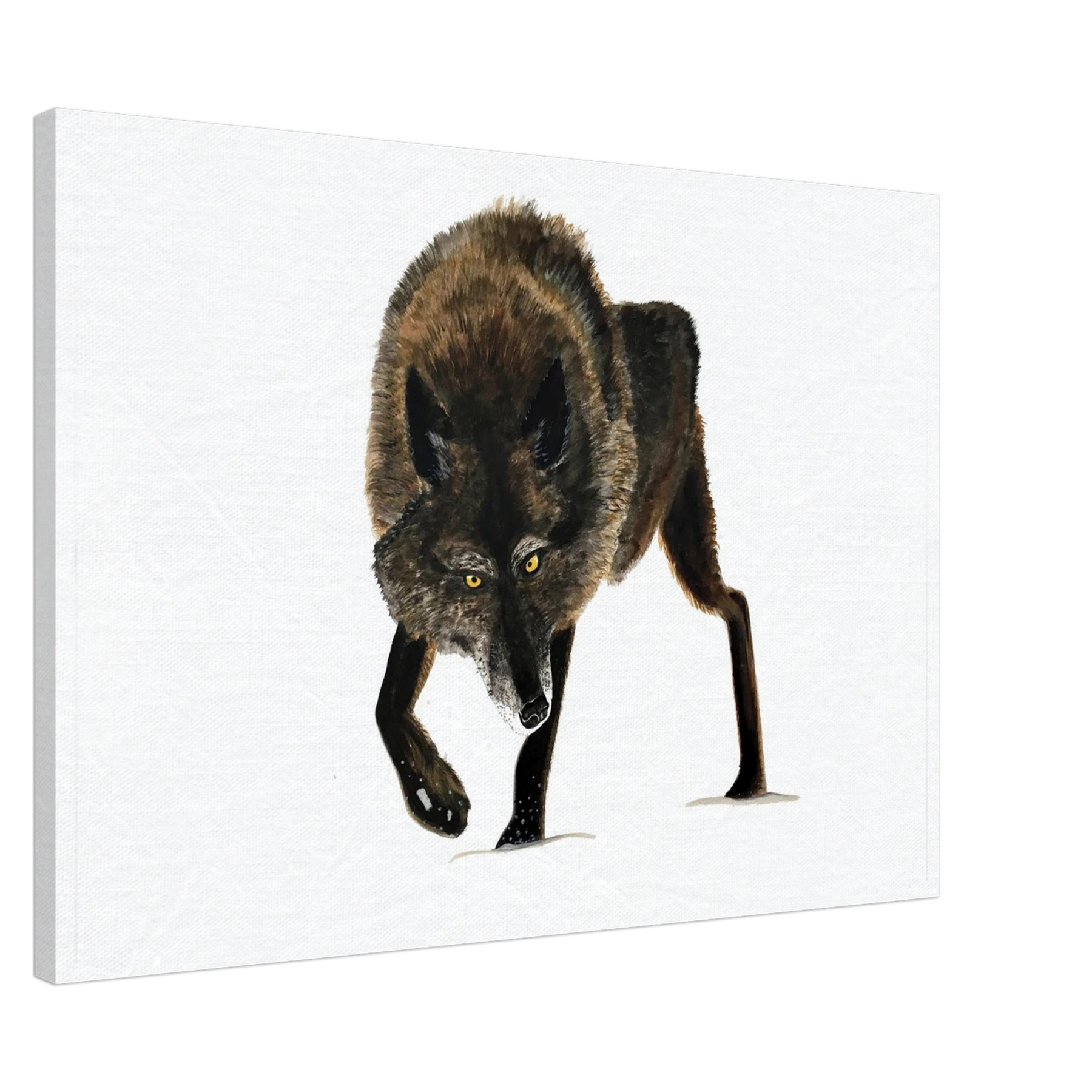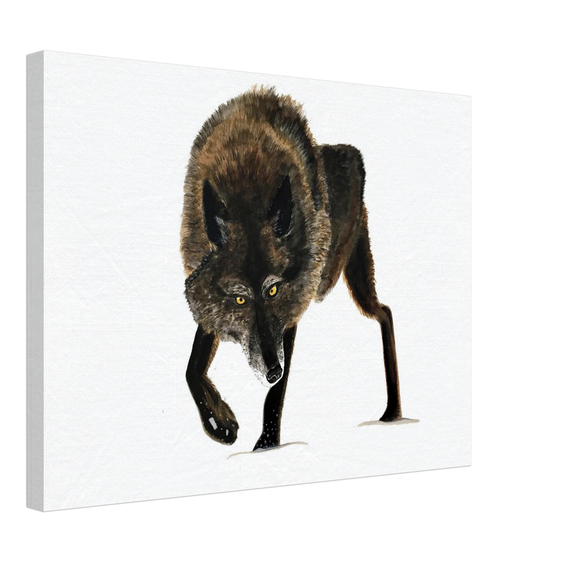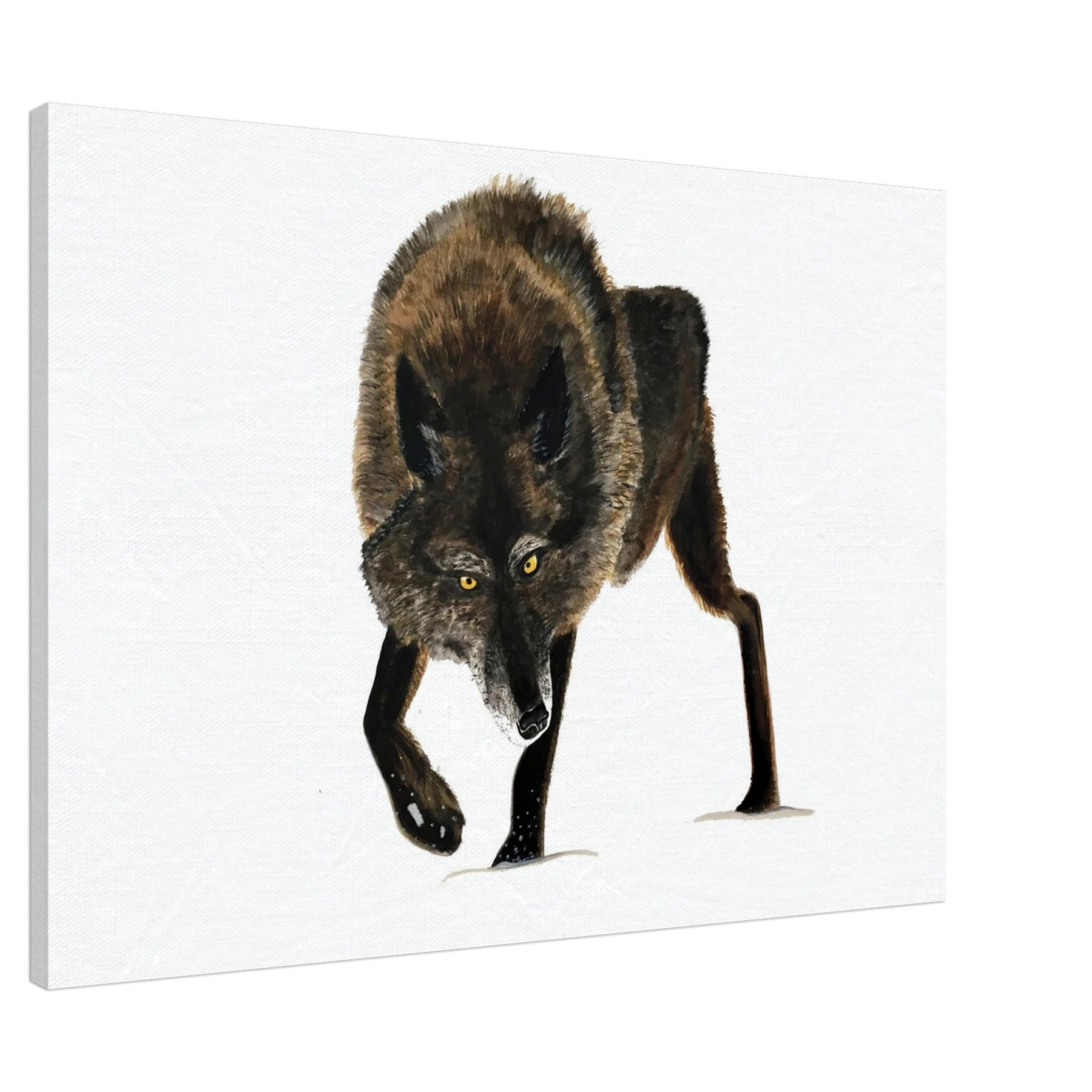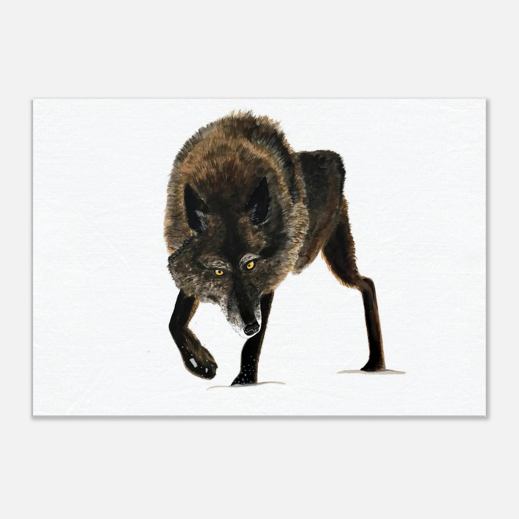 There’s a stillness in this moment—but it’s not passive. It’s focused, deliberate. This lone wolf, painted in rich, earthy tones, moves with quiet purpose across untouched snow. Every step is measured. Every glance, meaningful.