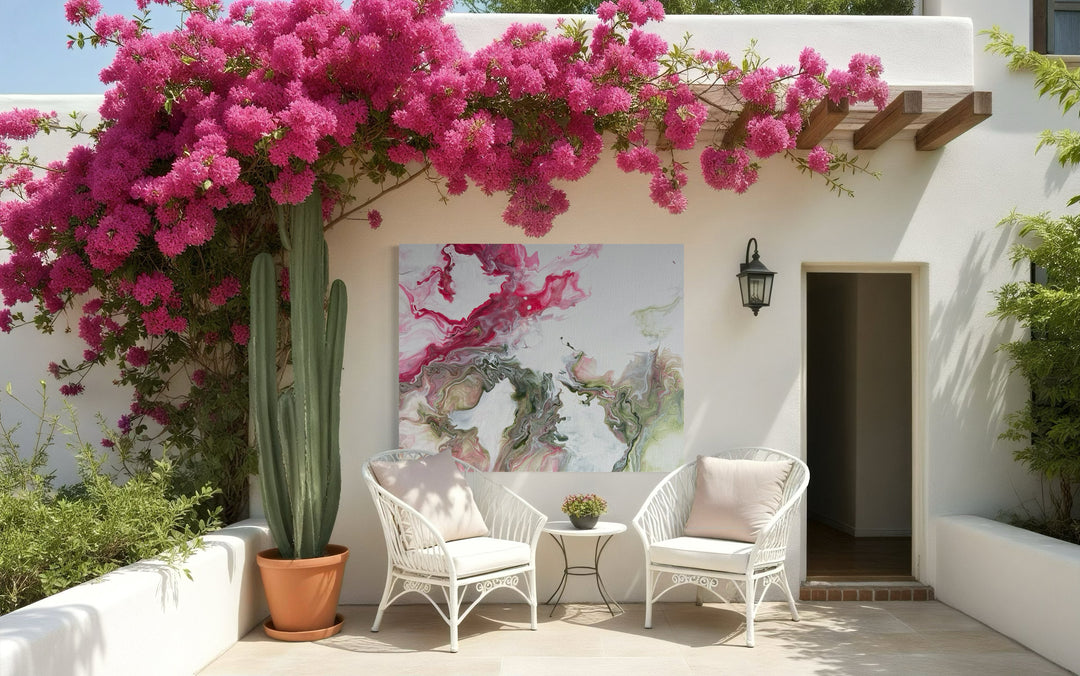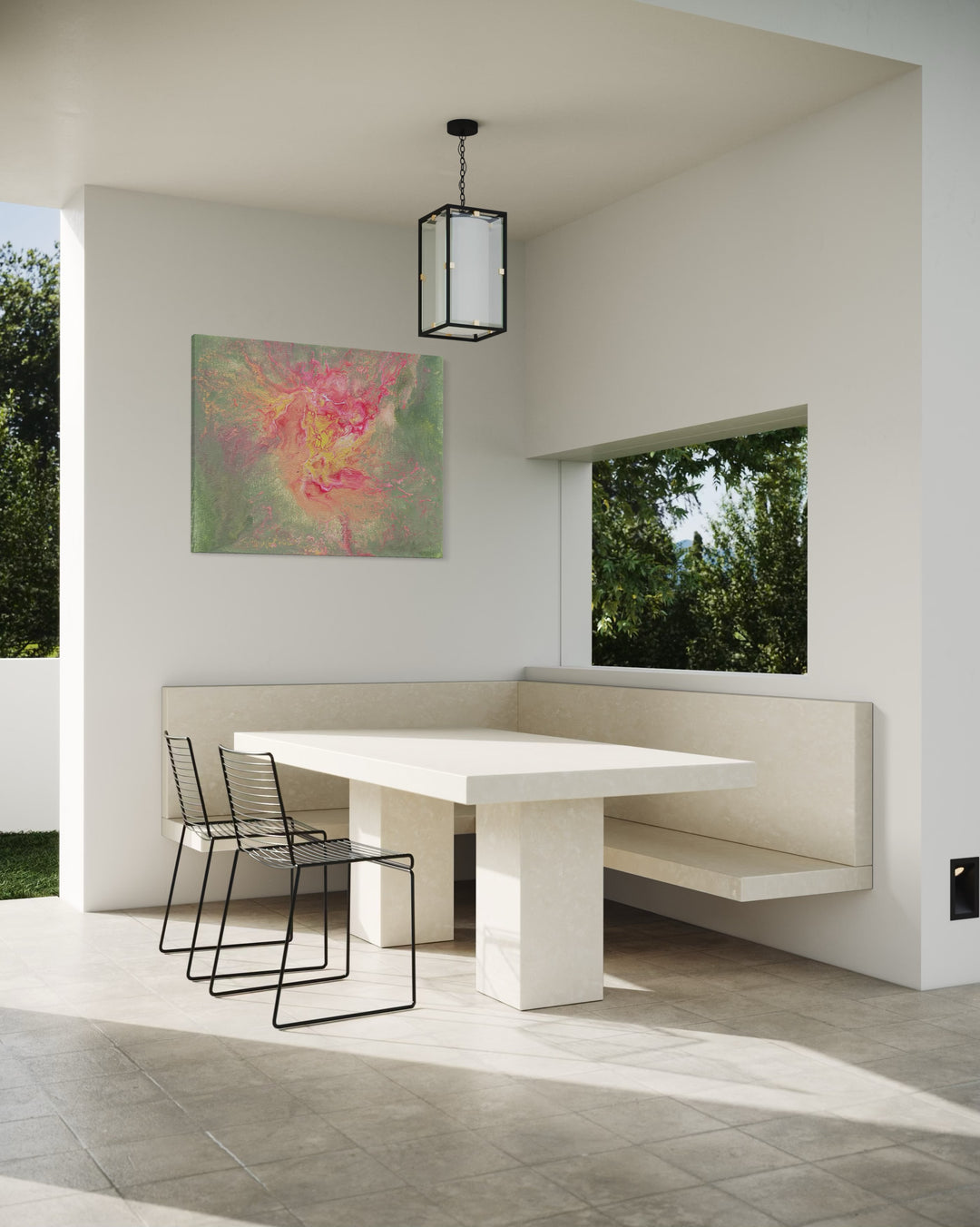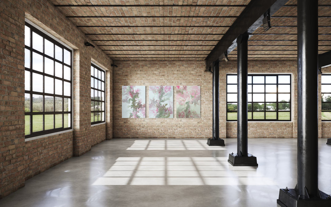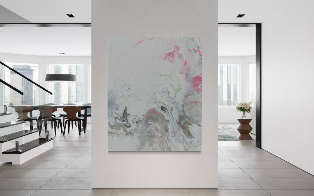 I painted this collection outdoors on our acreage in the Thousand Islands, during the summer after my daughter Autumn was born. She was just a few months old then, nestled nearby while I worked in the warm sunlight. The days were slow and simple, full of baby snuggles, birdsong, and the sound of paint pouring across canvas. I wasn’t trying to make a collection at first. I was just trying to breathe, to process, to return to something that felt like me again.