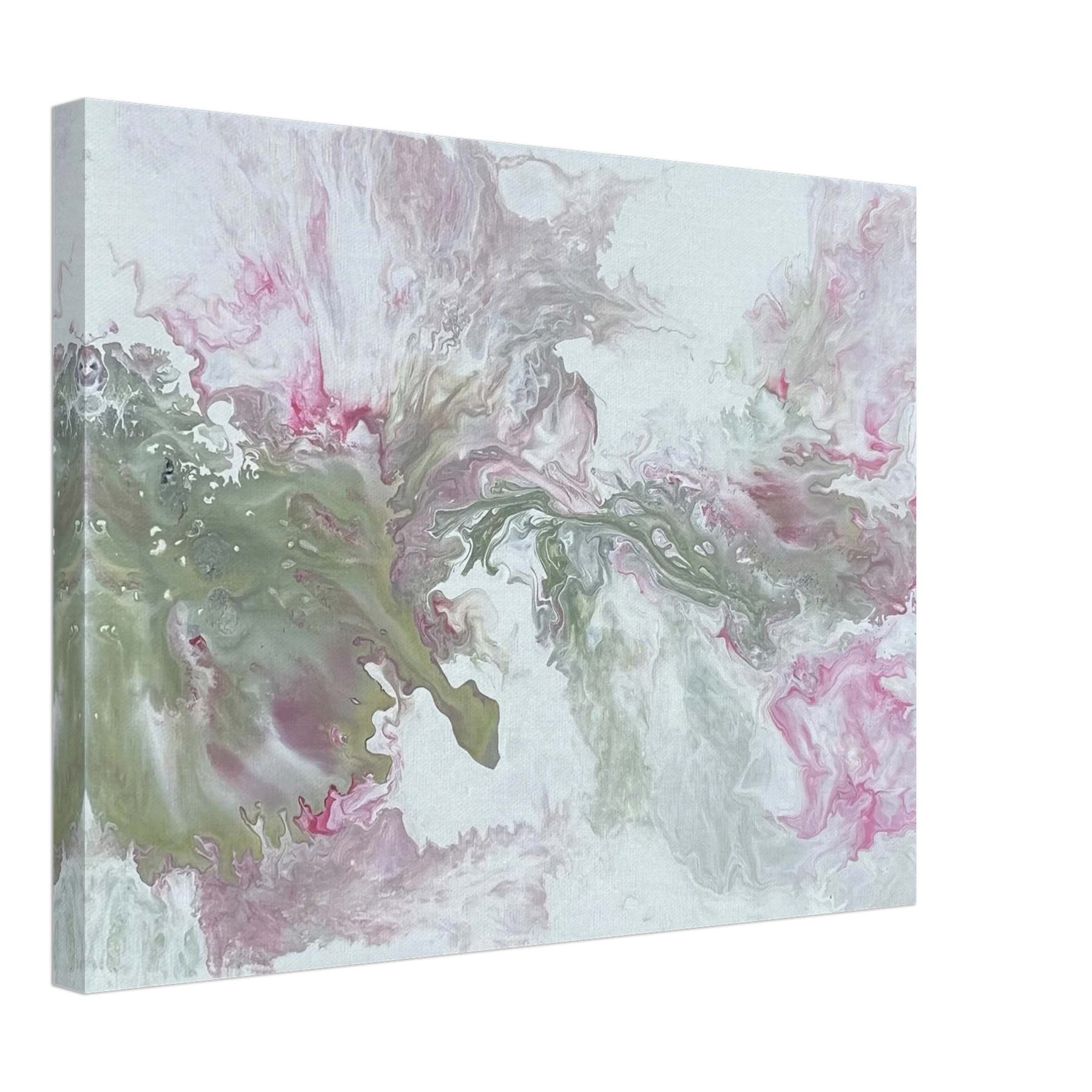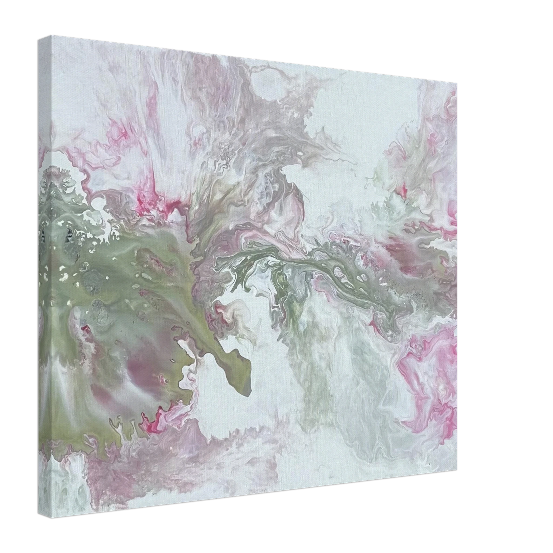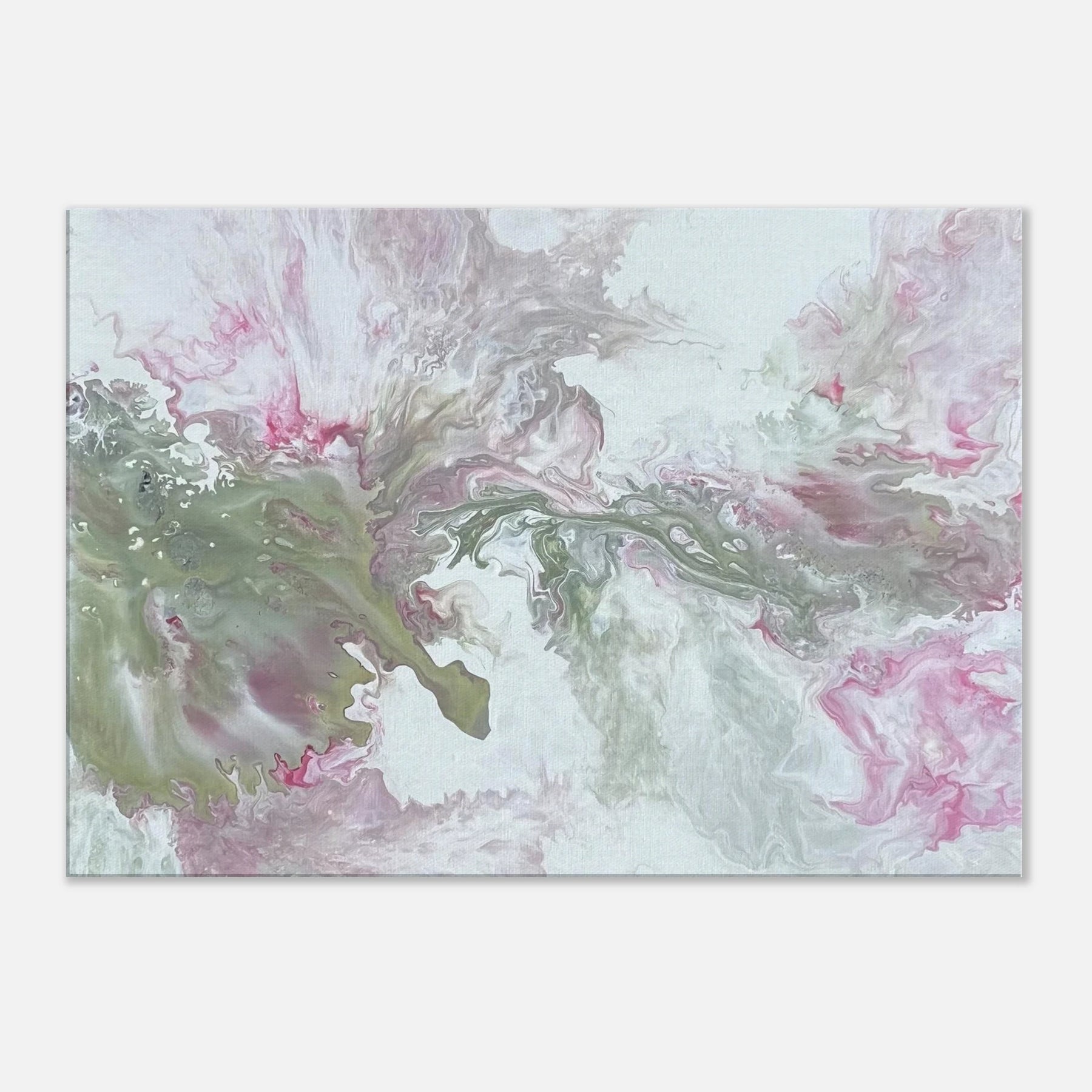 Rooted II continues the visual language of its pair, with a slightly deeper bloom of green and a soft swirling upward pull. The colors — warm sage, petal pink, and soft blush — feel like something organic and still in motion, a reminder that being rooted doesn’t mean being still, but growing with intention.