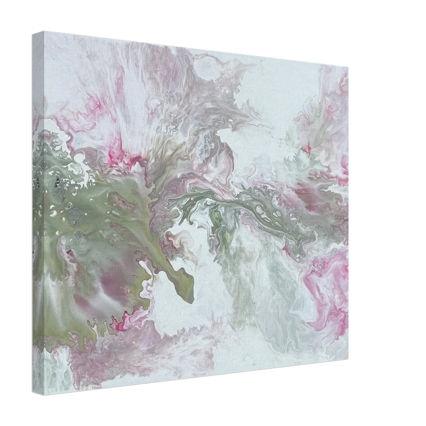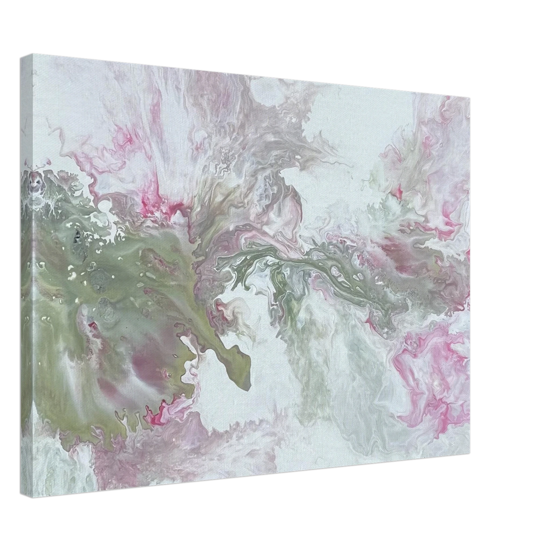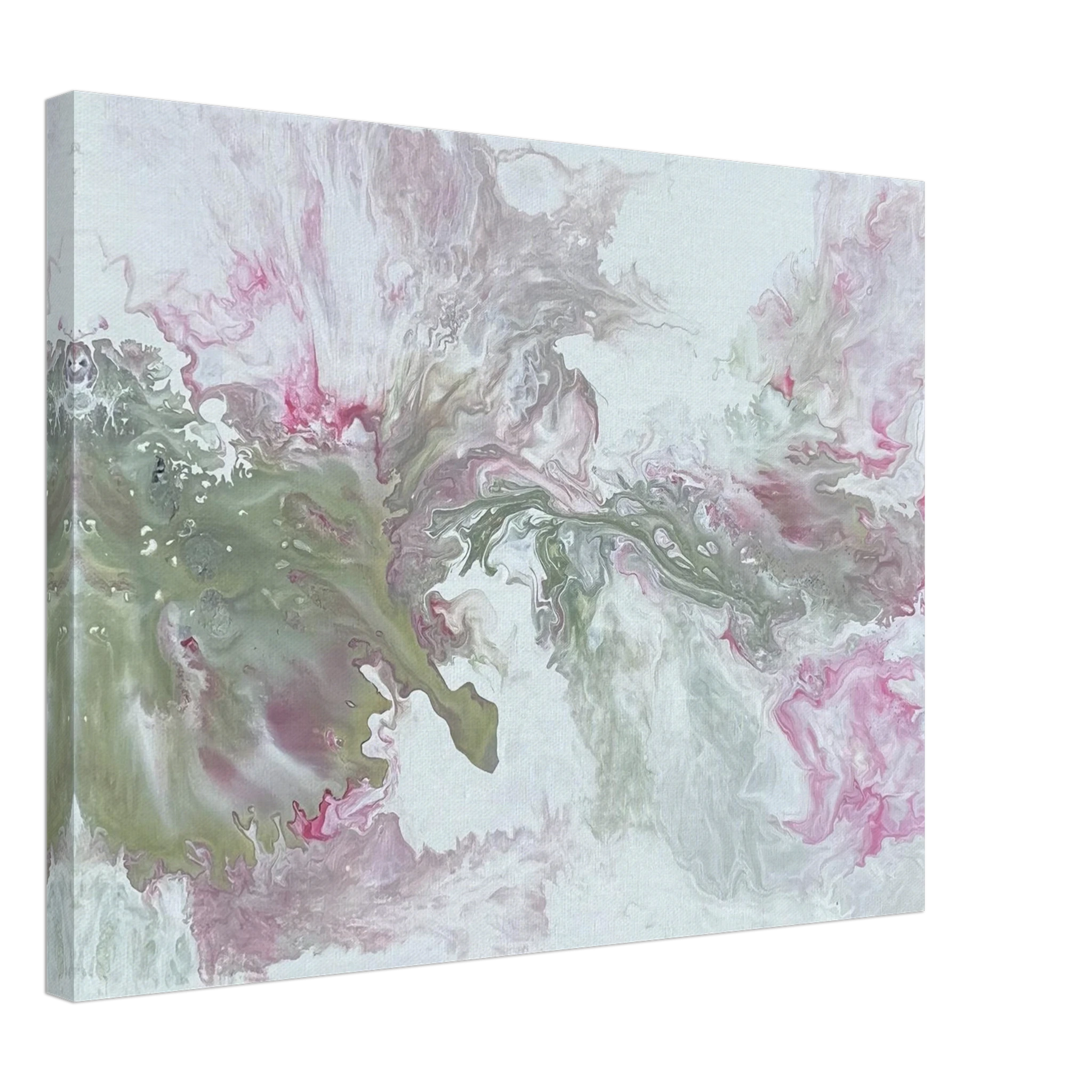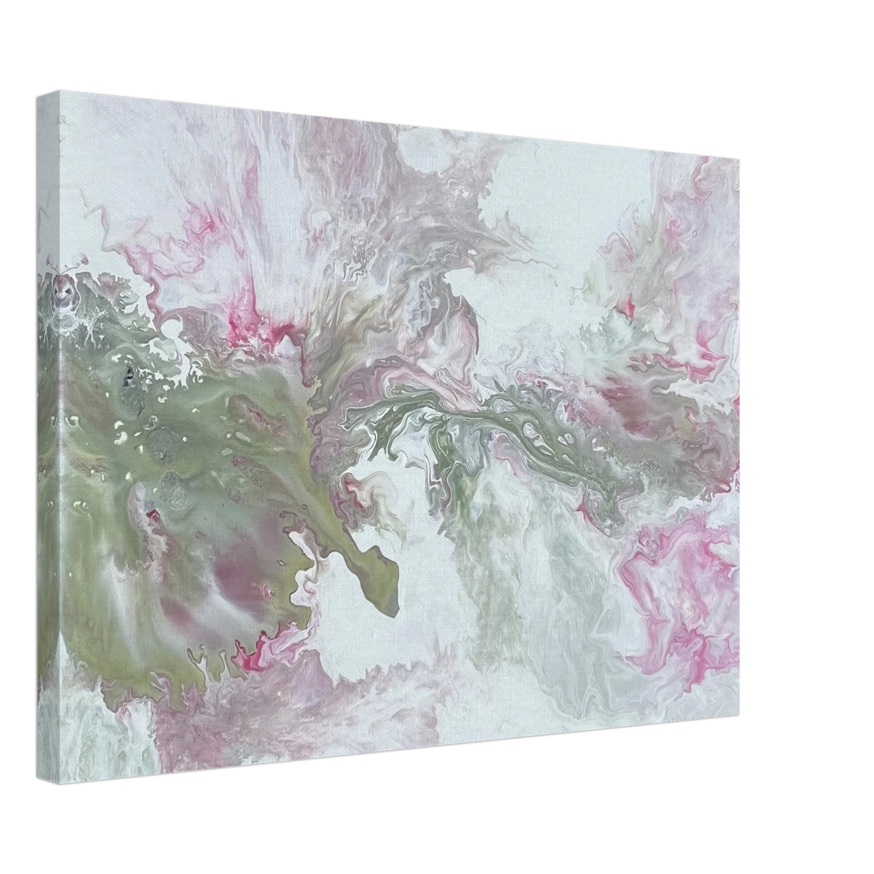 Rooted II continues the visual language of its pair, with a slightly deeper bloom of green and a soft swirling upward pull. The colors — warm sage, petal pink, and soft blush — feel like something organic and still in motion, a reminder that being rooted doesn’t mean being still, but growing with intention.