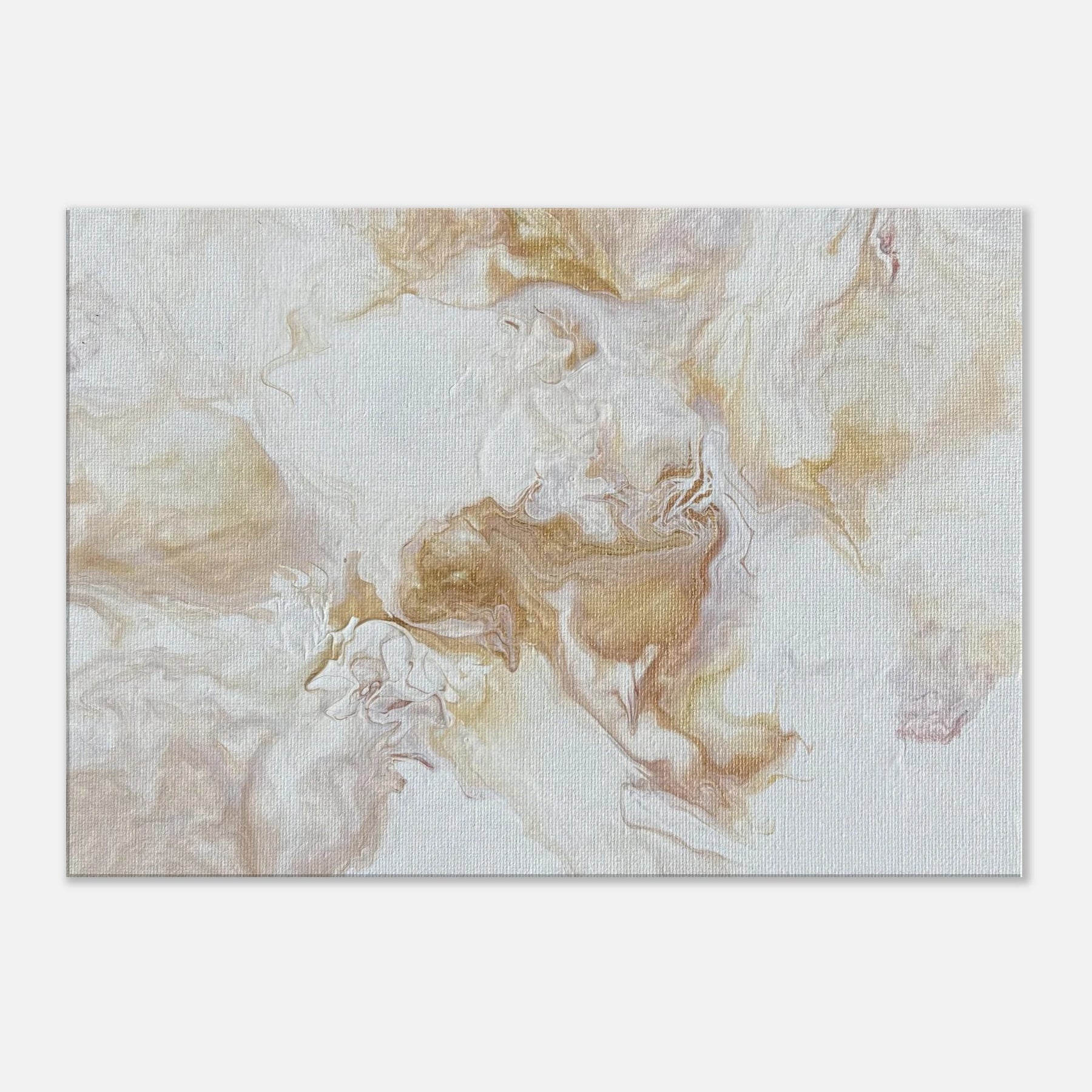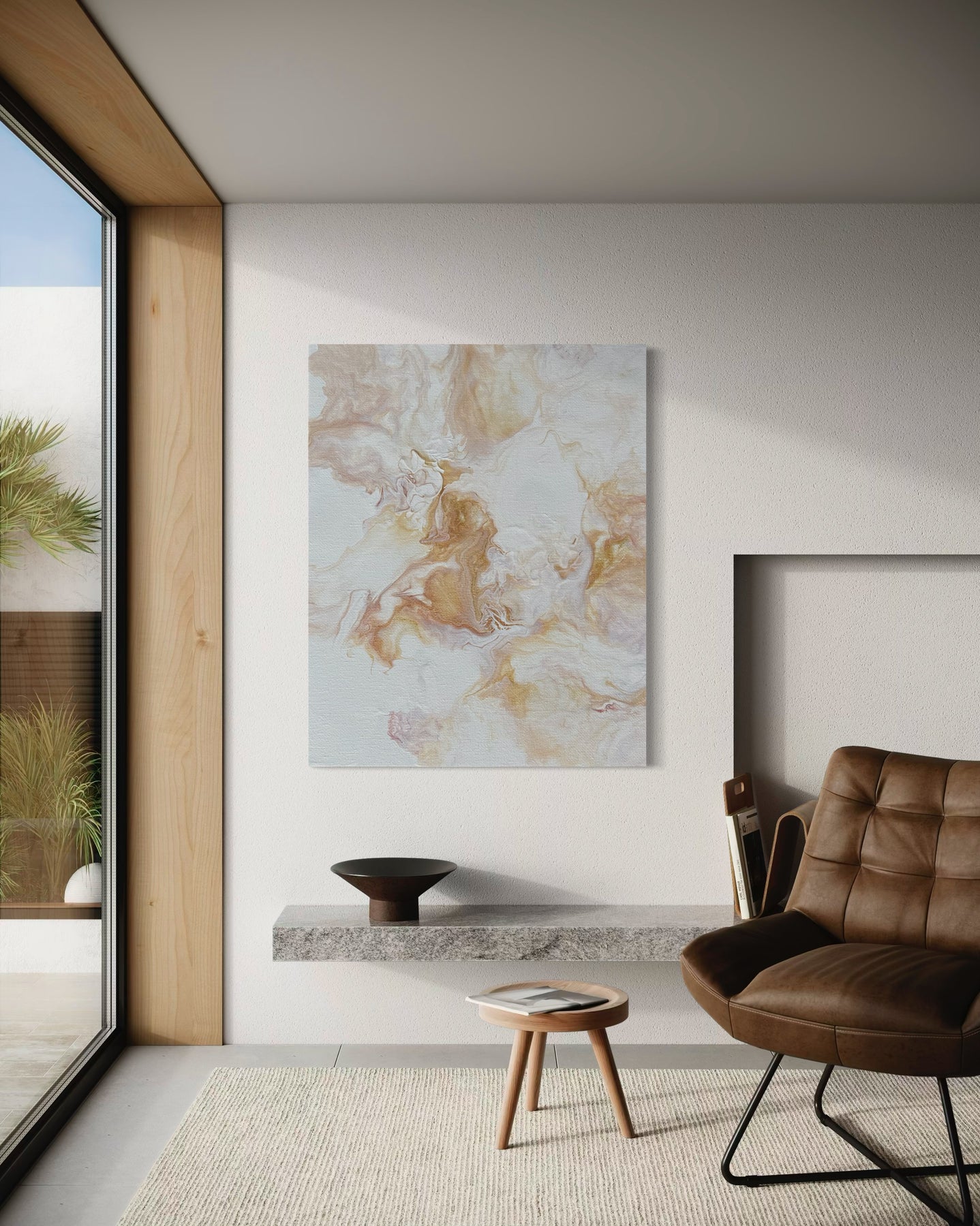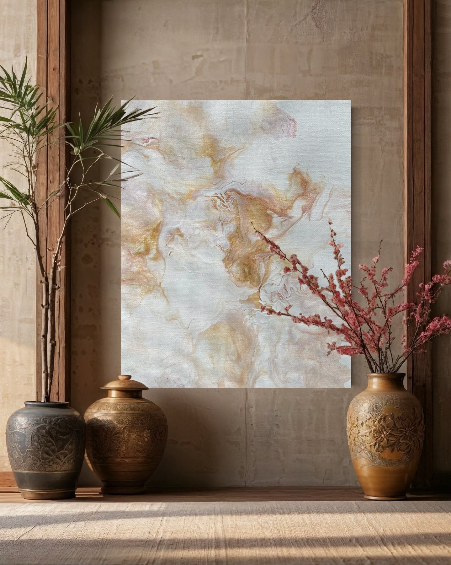 Creams and golds drift across the canvas like light through linen — gentle, warm, and steady. The movement is subtle but full of meaning, like the unspoken bond between mother and child in the first quiet weeks. There’s no rush here, only presence. The kind that fills a room without needing words.