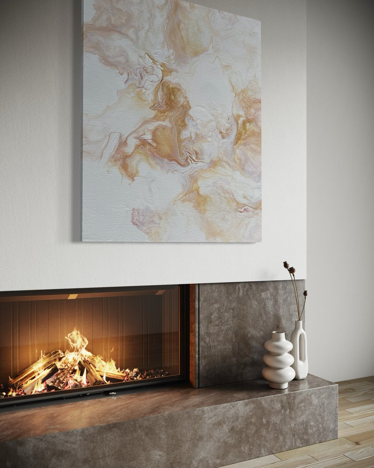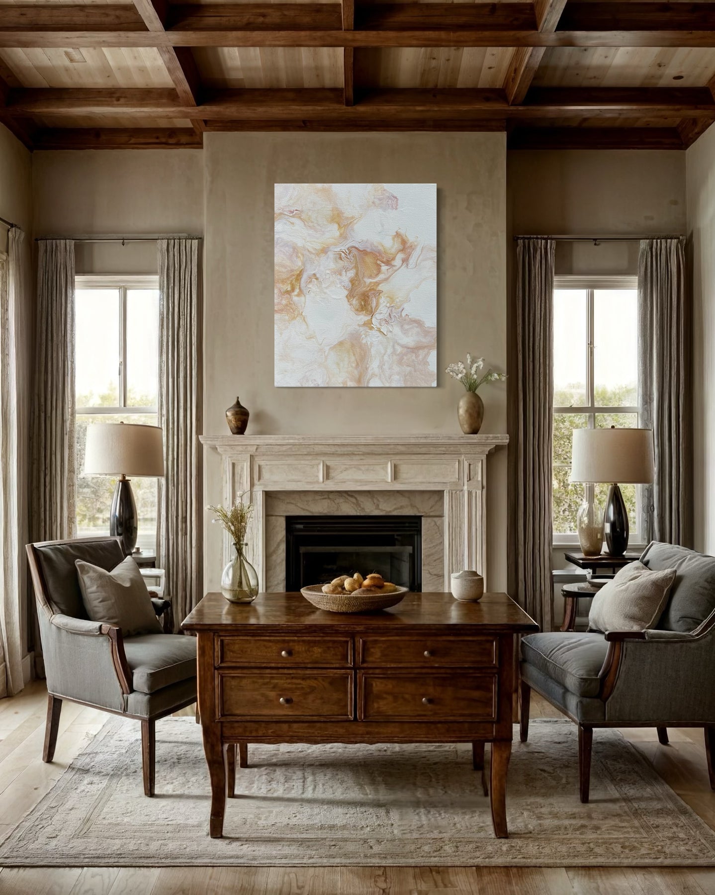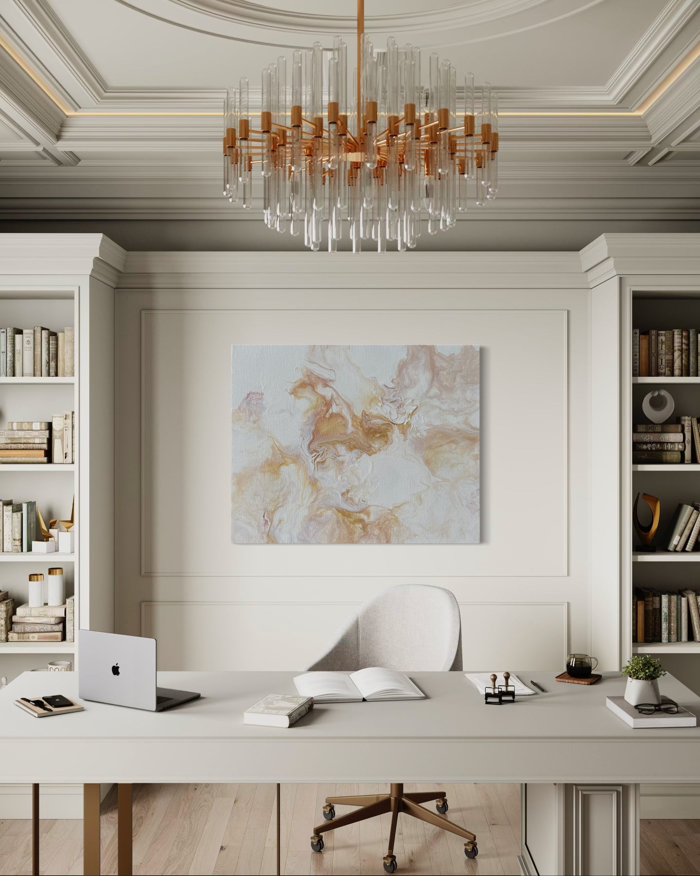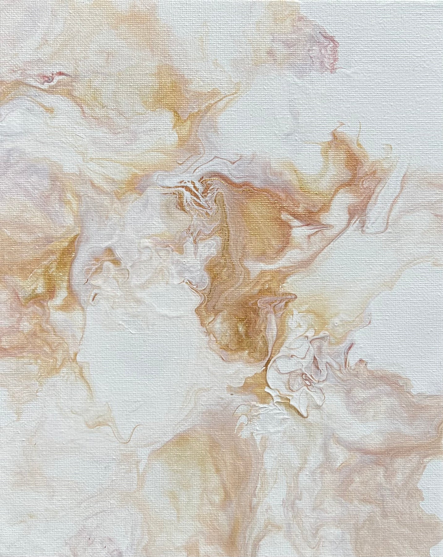 Creams and golds drift across the canvas like light through linen — gentle, warm, and steady. The movement is subtle but full of meaning, like the unspoken bond between mother and child in the first quiet weeks. There’s no rush here, only presence. The kind that fills a room without needing words.