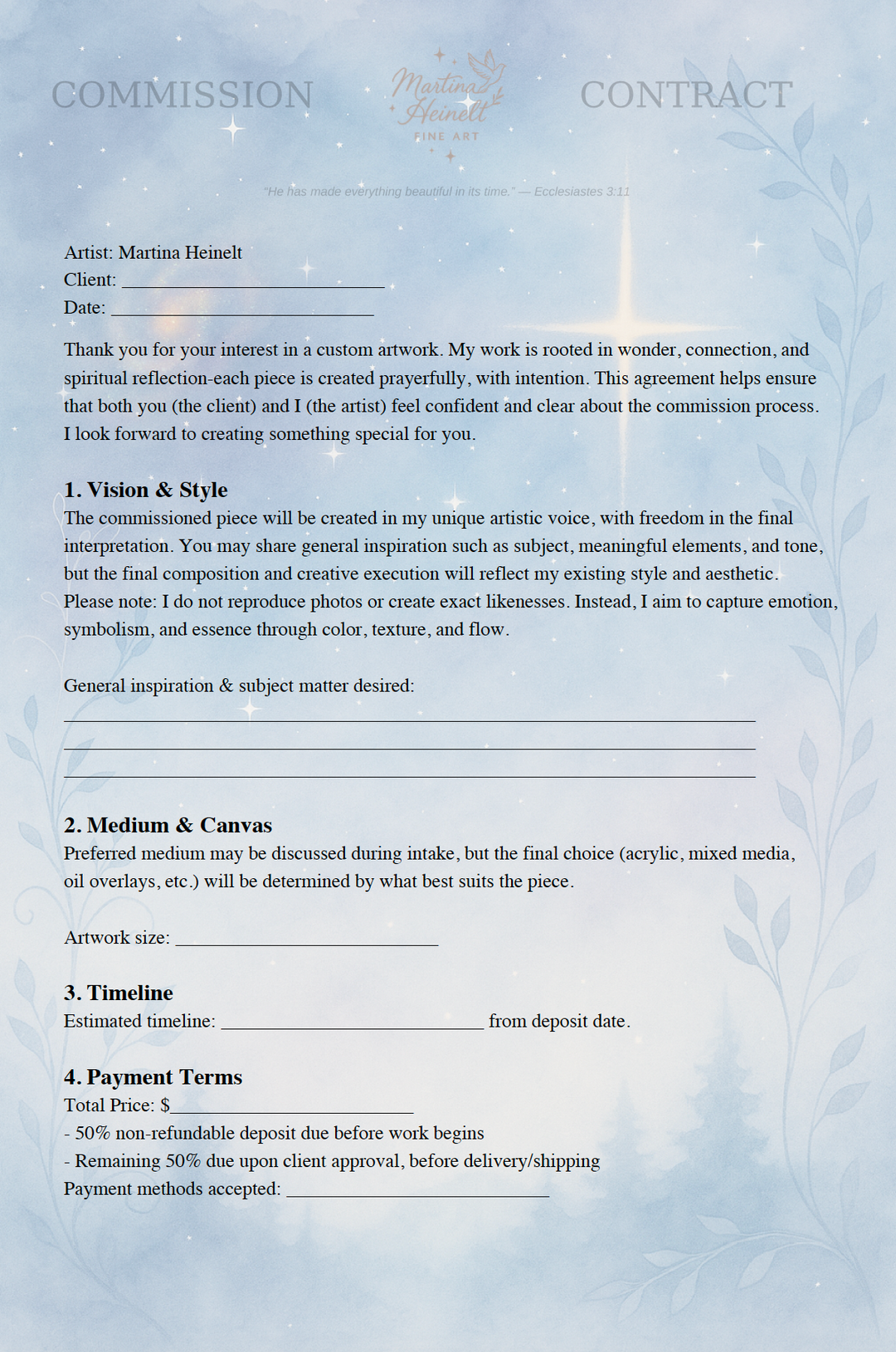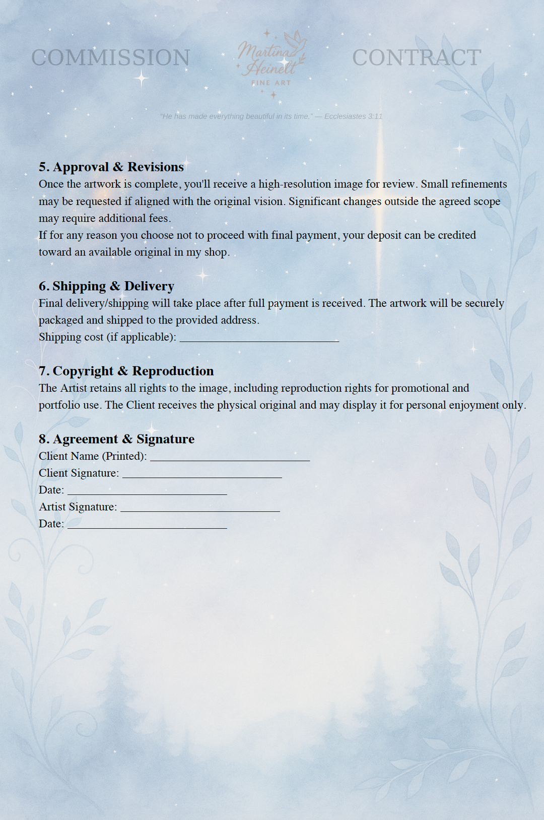 To ensure clarity and a smooth creative process, all custom artwork is completed under the terms outlined in the commission contract below.