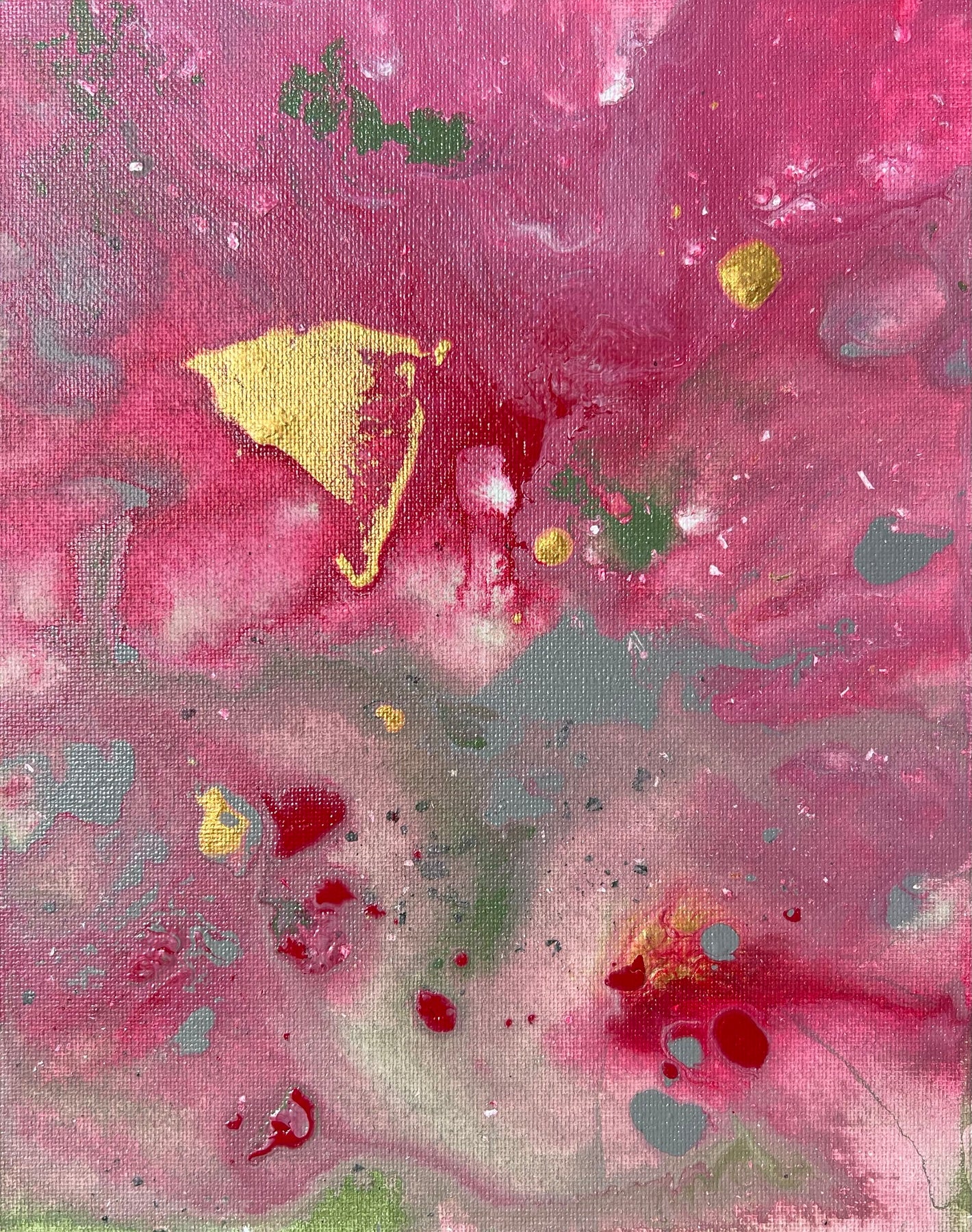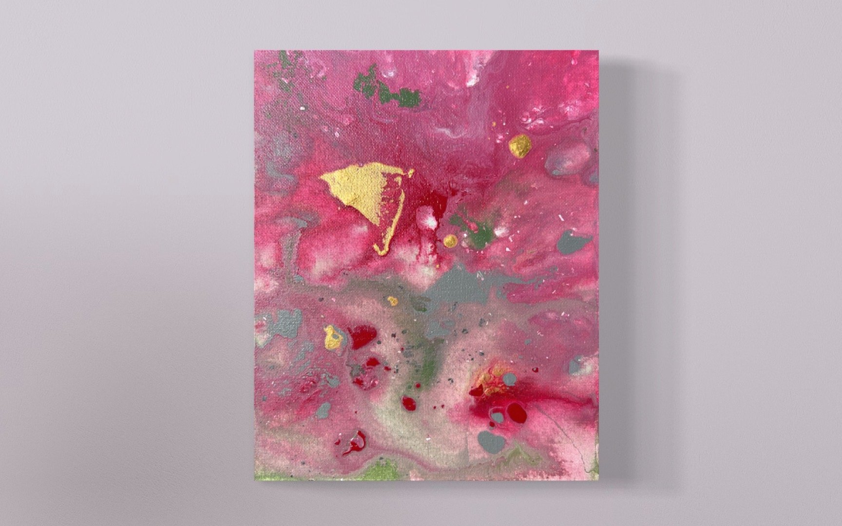 The canvas dances with vivid pinks and scattered drops of red, grey, green, and gold — like petals or praise tossed into the air. A golden form rises near the center, like a sail catching wind or a heart catching hope. The motion is light but not aimless — it moves upward, outward, free.