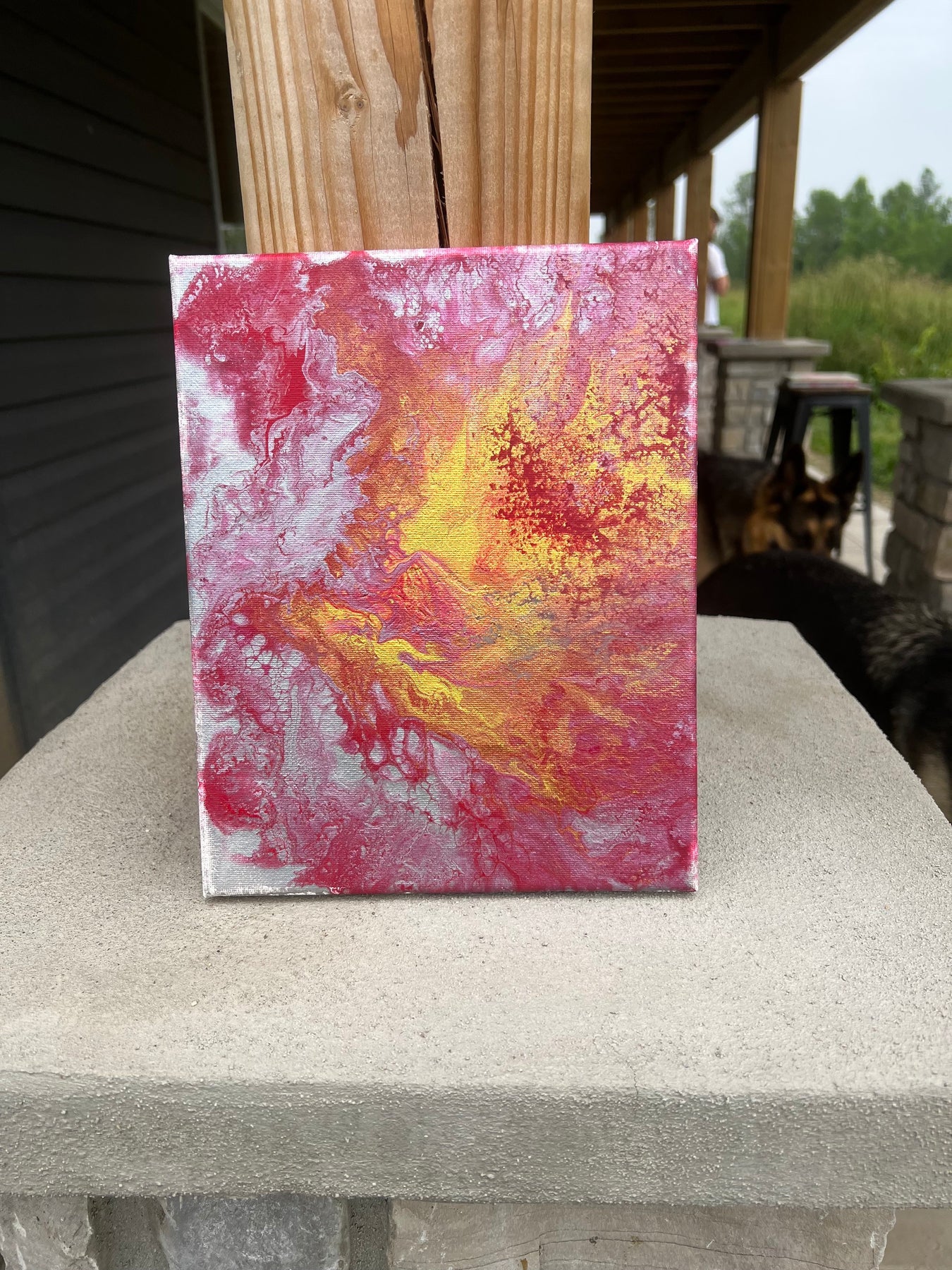Ignite was painted during a golden summer on our acreage in the Thousand Islands of Ontario. My daughter Autumn was just a few months old, and I was completely wrapped in that first wave of maternal love — the kind that changes the shape of your heart forever. I remember holding her in one arm and painting with the other, the breeze carrying the scent of the trees and the sound of birdsong as I poured.
