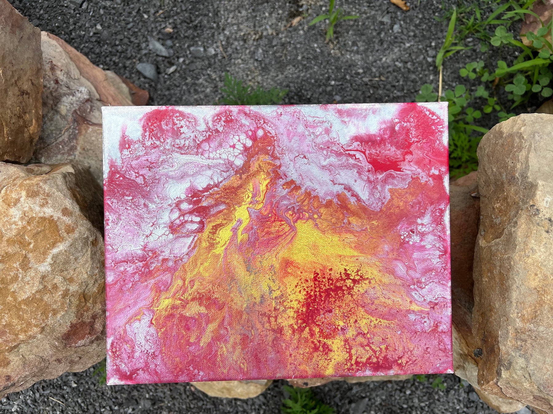 This piece reflects the intensity of that season — not soft or quiet, but bold, radiant, and alive. The saturated pinks and molten golds speak to the overwhelming beauty I felt in those moments. There’s a heat to it, like a rush of Spirit — a kind of spiritual ignition that burned through me as I stood on holy ground, a mother for the first time.