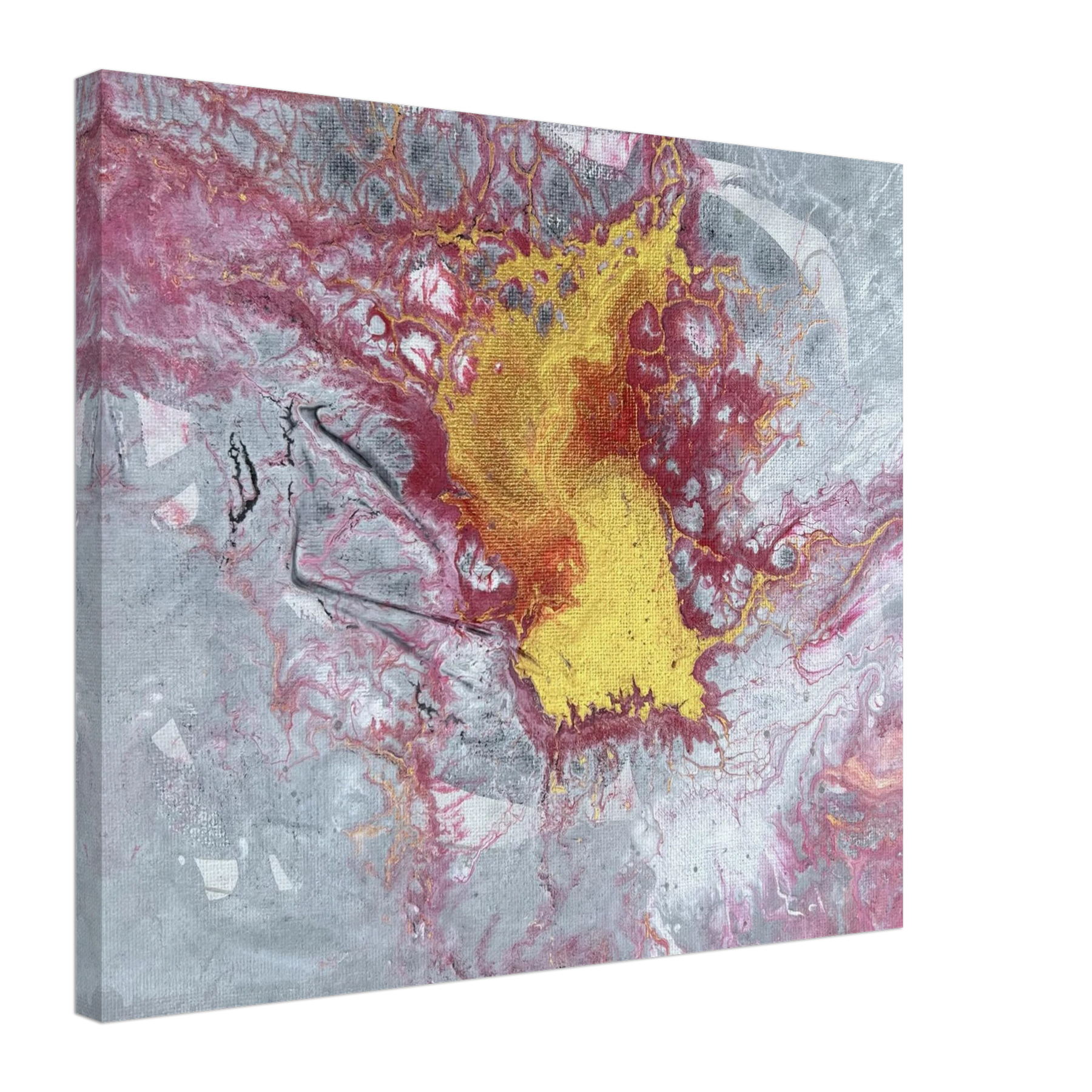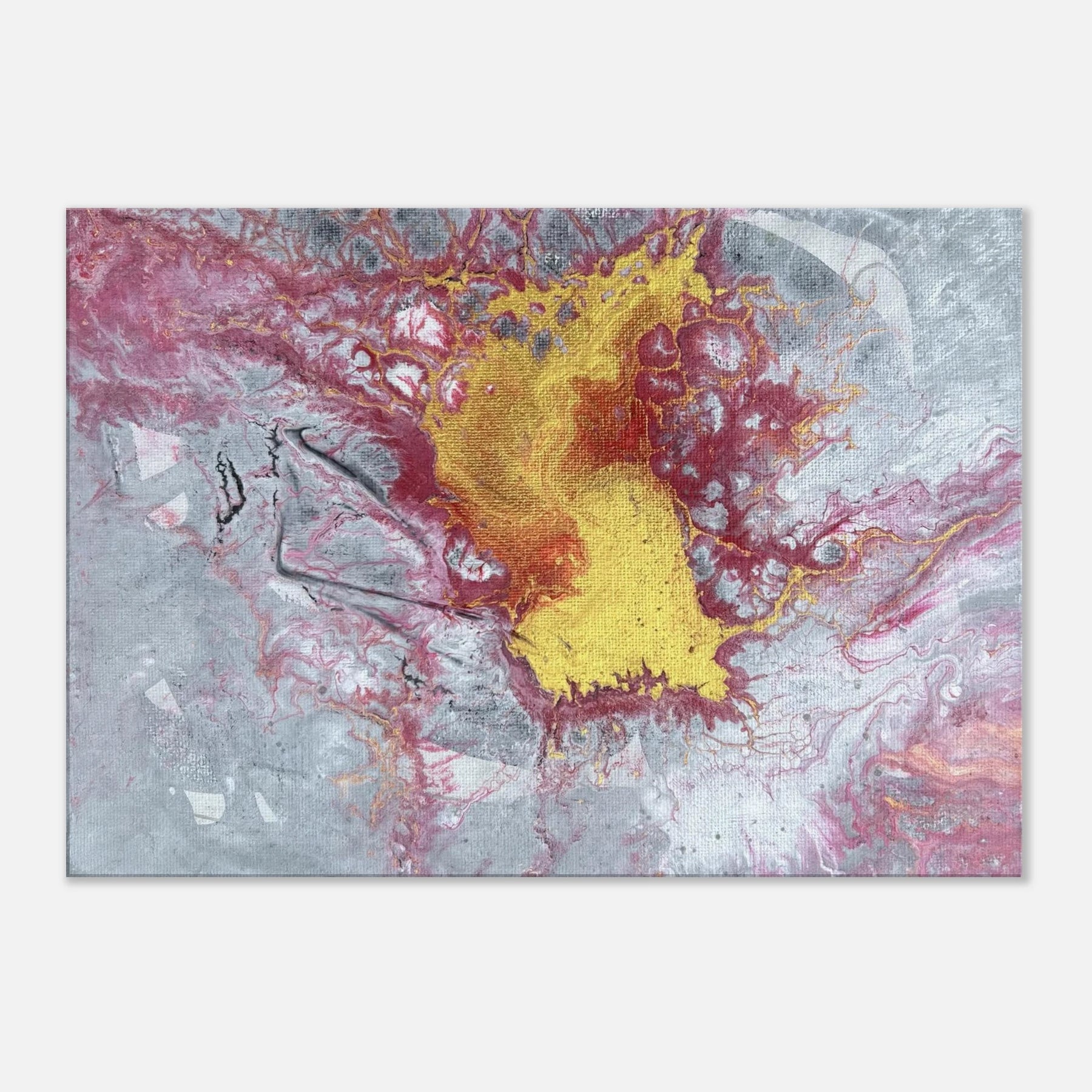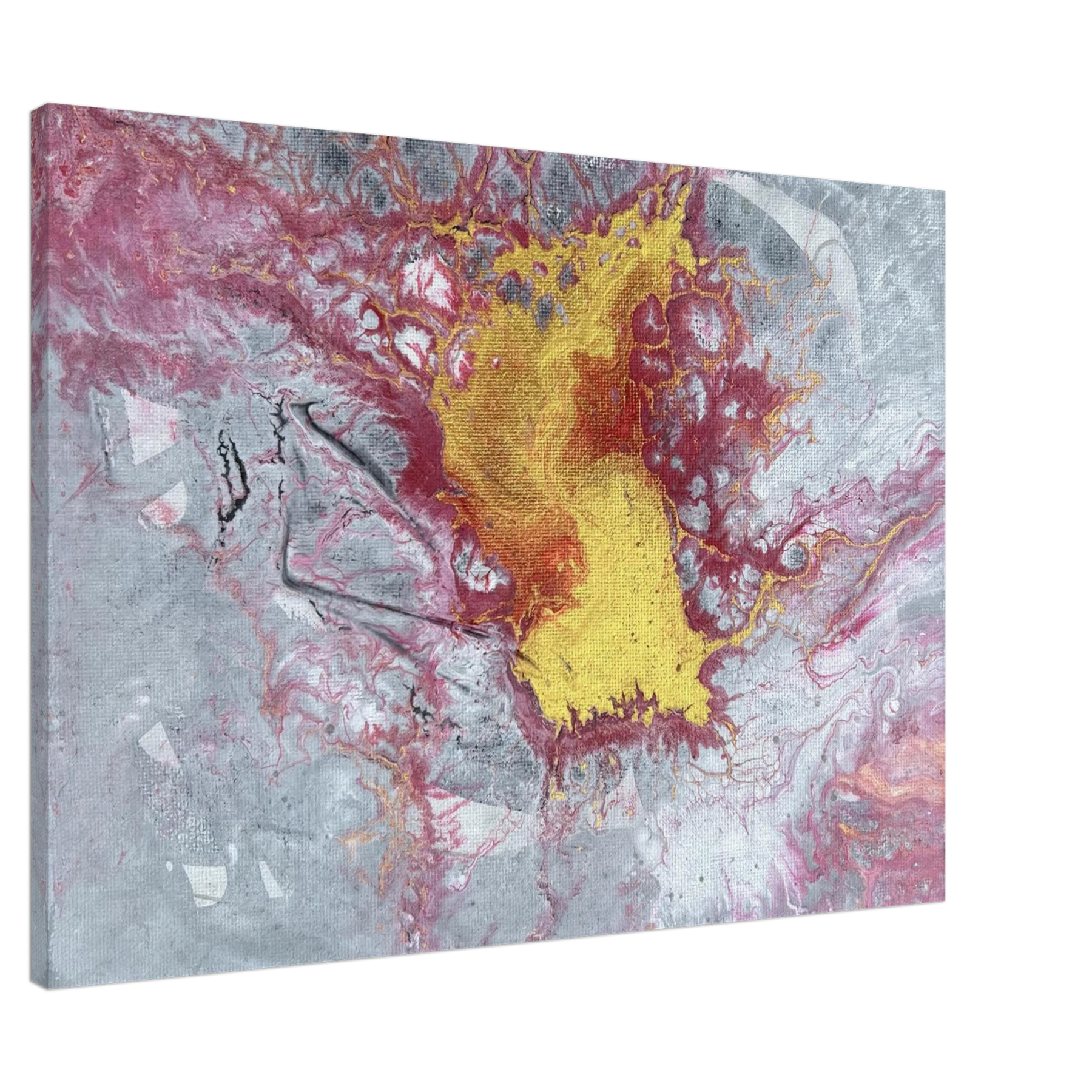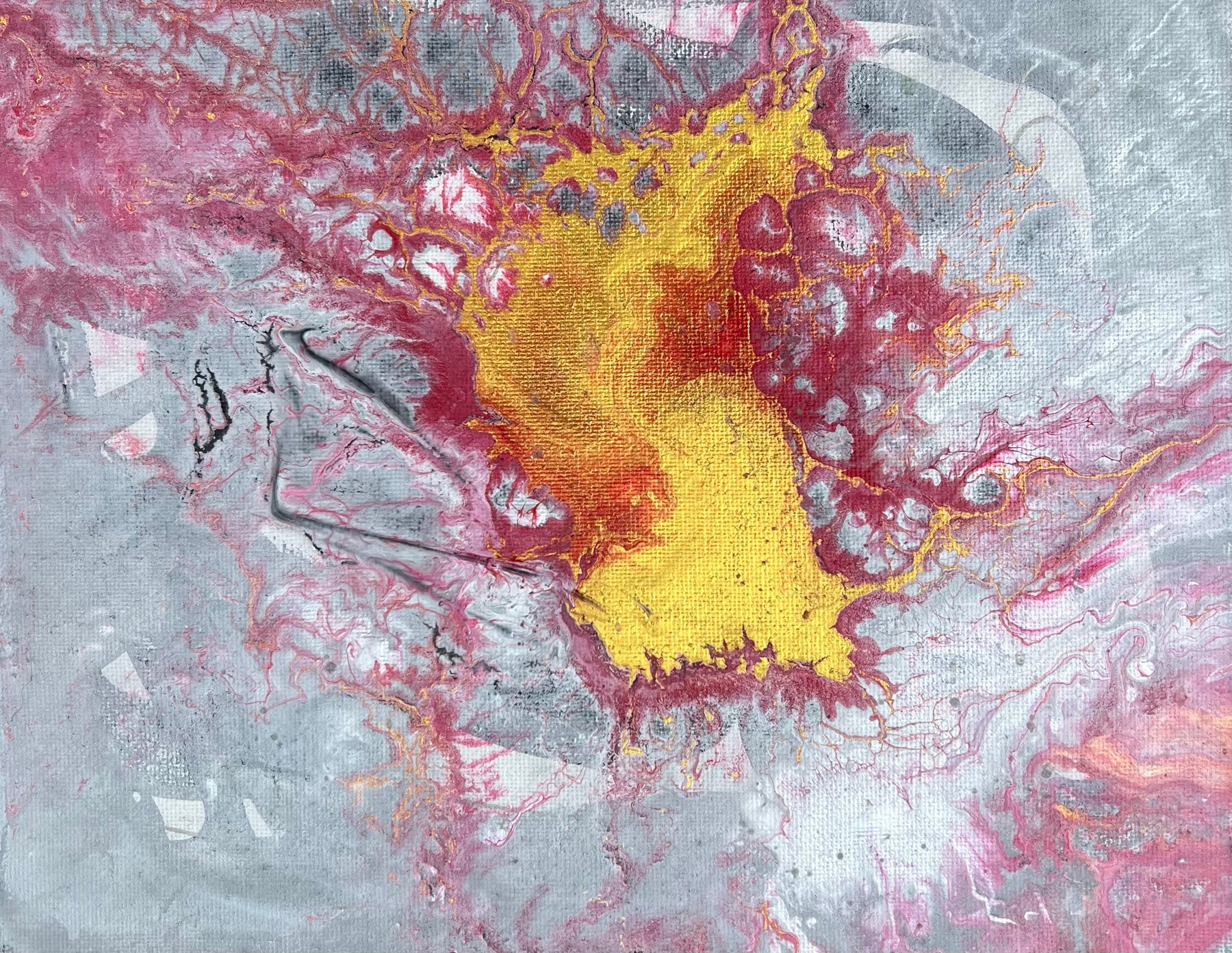 The center glows with molten gold, surrounded by crimson and ash-toned greys that stretch and crack like stone under pressure. Textures ripple and break apart, like something sacred forcing its way to the surface. This is not a peaceful painting — it’s alive, stirring, and full of Spirit-led tension. It carries the energy of surrender, breakthrough, and divine refining.