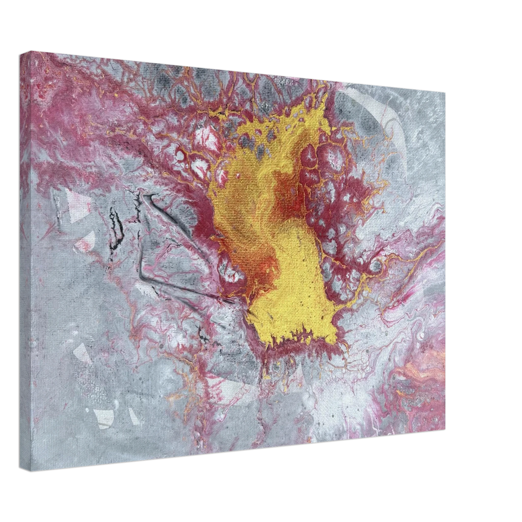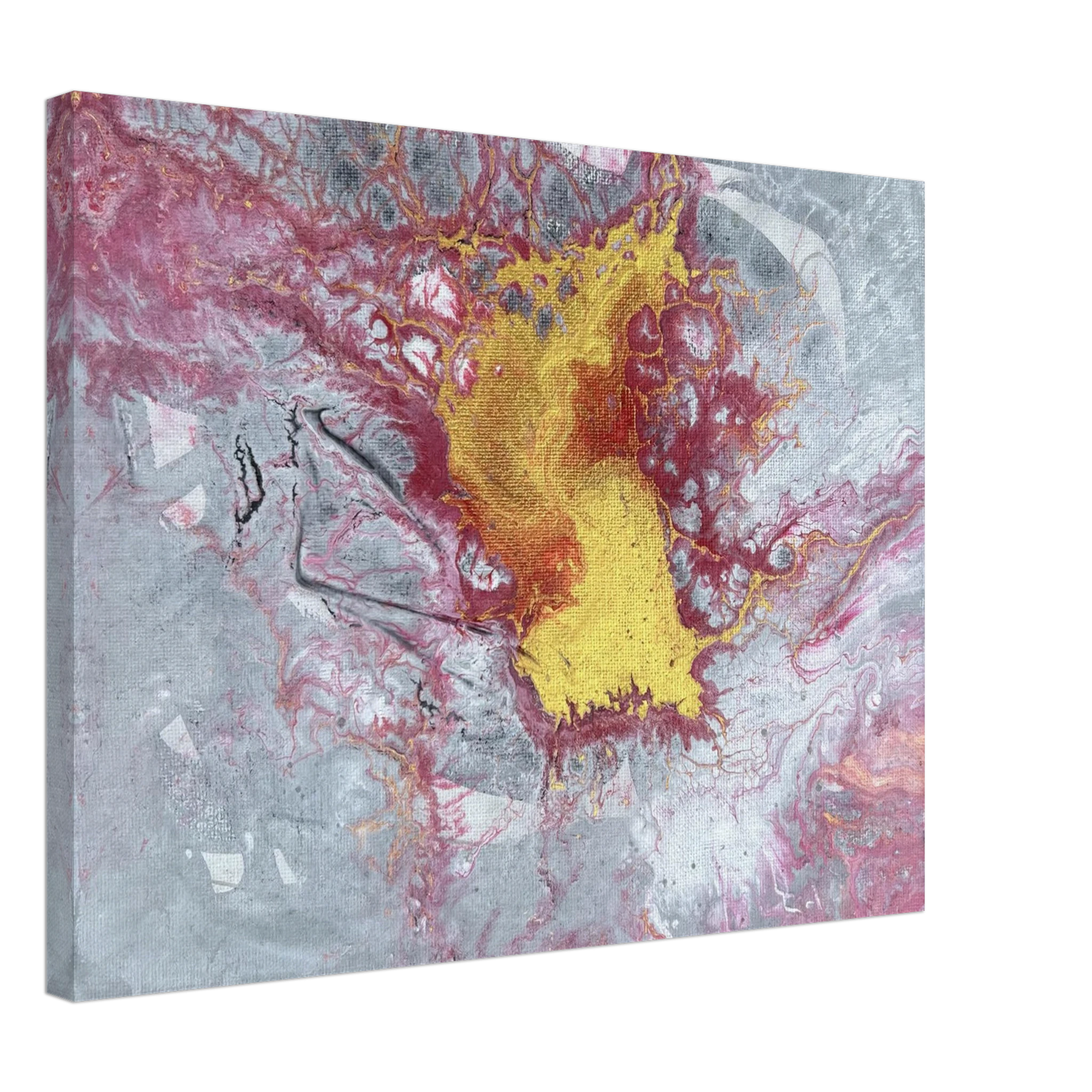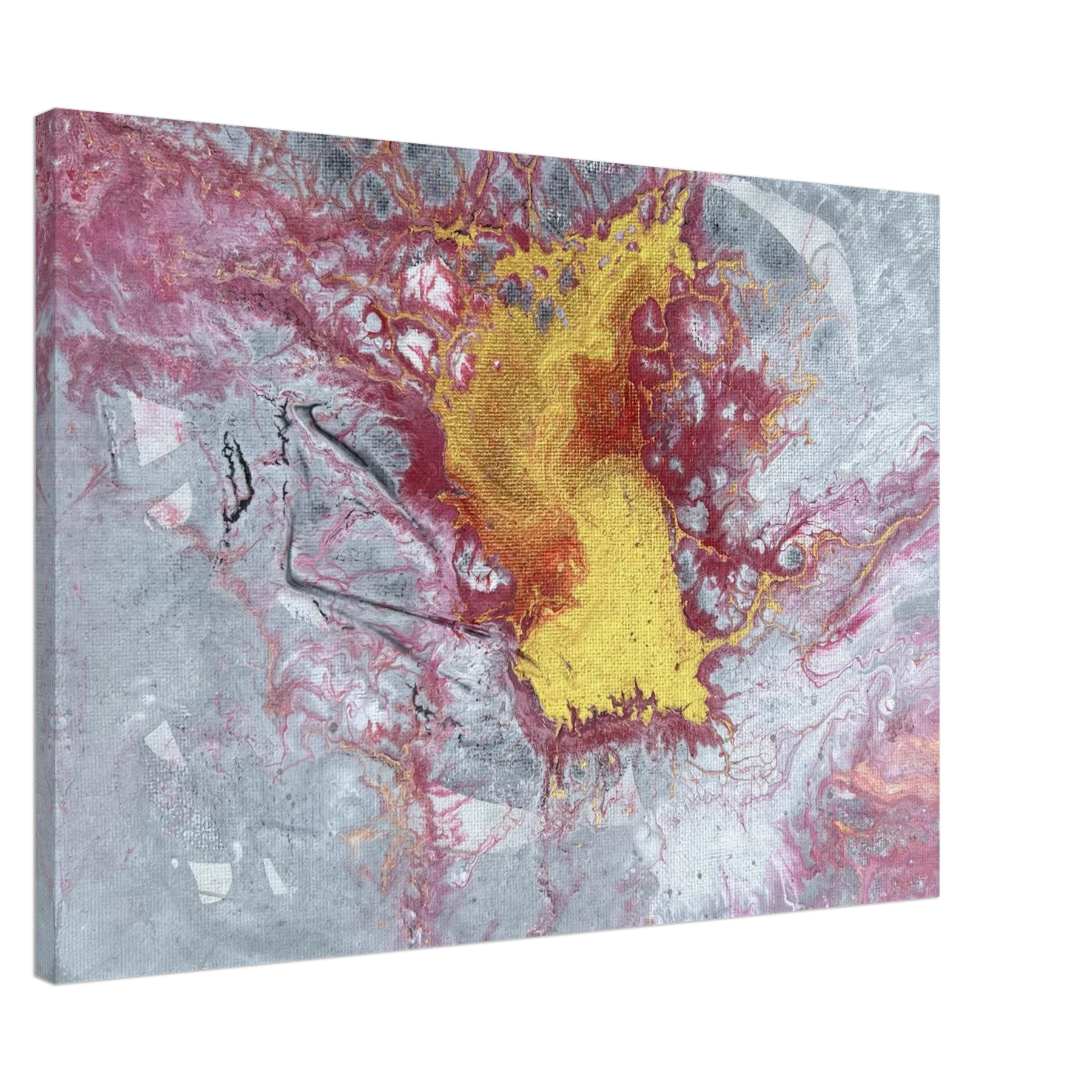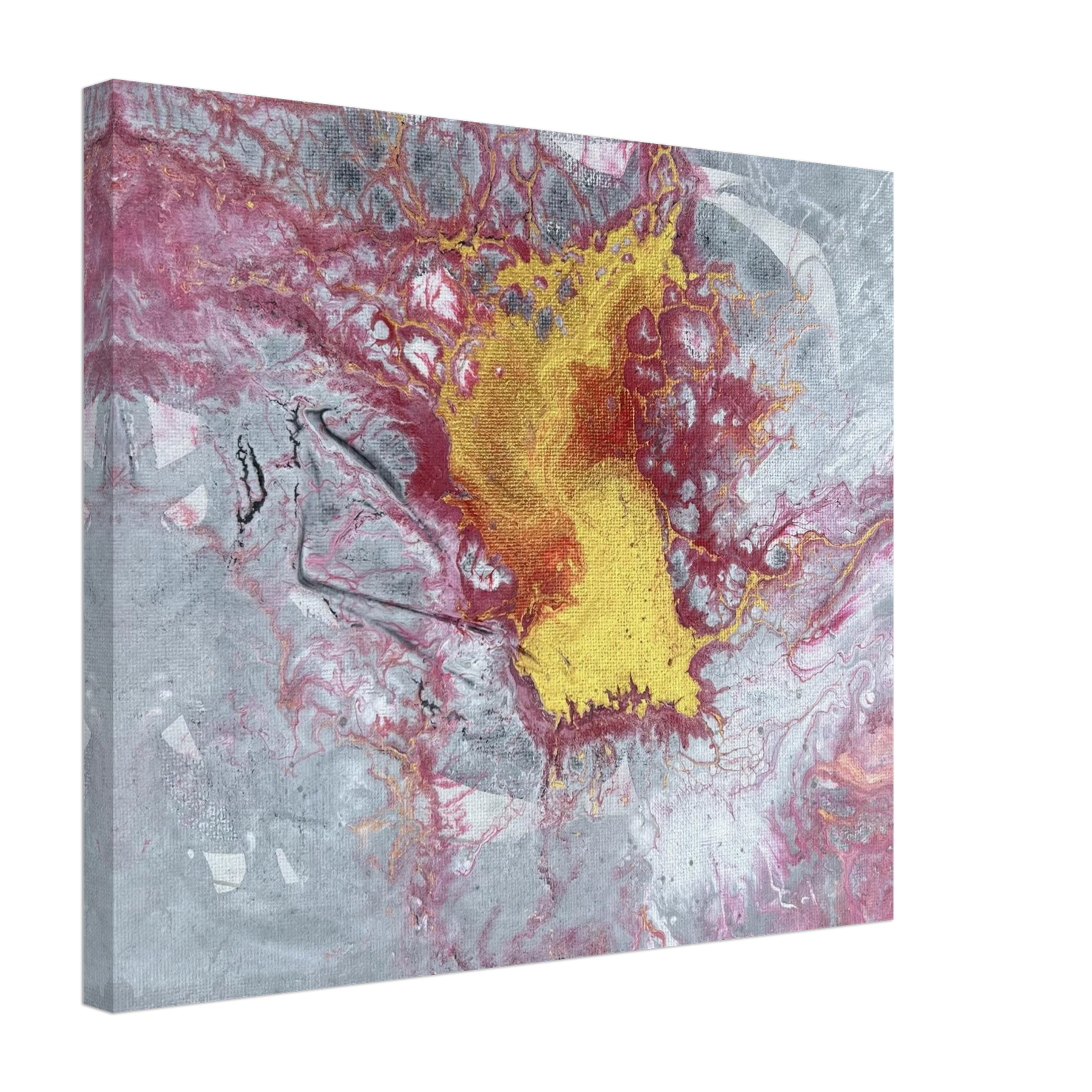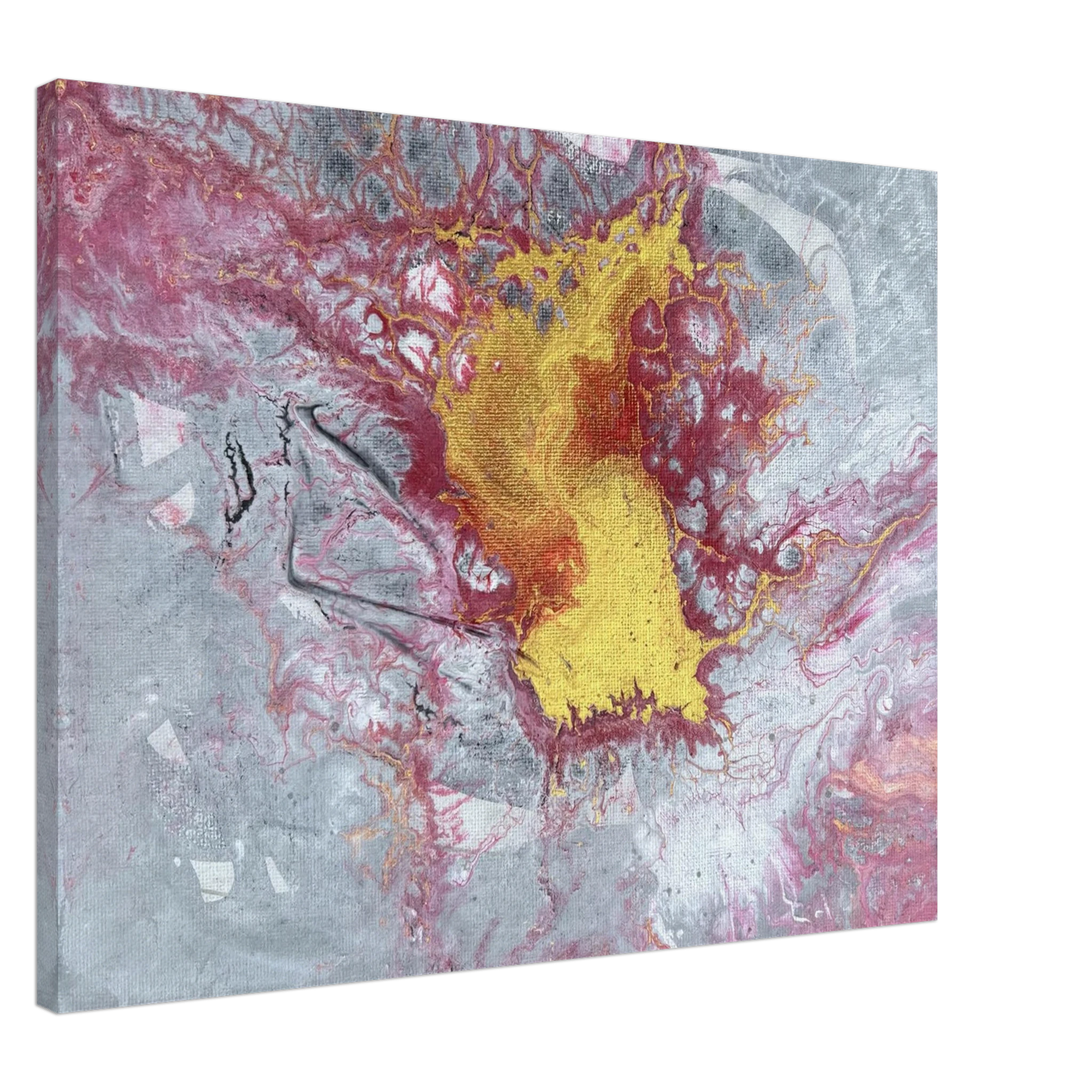The center glows with molten gold, surrounded by crimson and ash-toned greys that stretch and crack like stone under pressure. Textures ripple and break apart, like something sacred forcing its way to the surface. This is not a peaceful painting — it’s alive, stirring, and full of Spirit-led tension. It carries the energy of surrender, breakthrough, and divine refining.